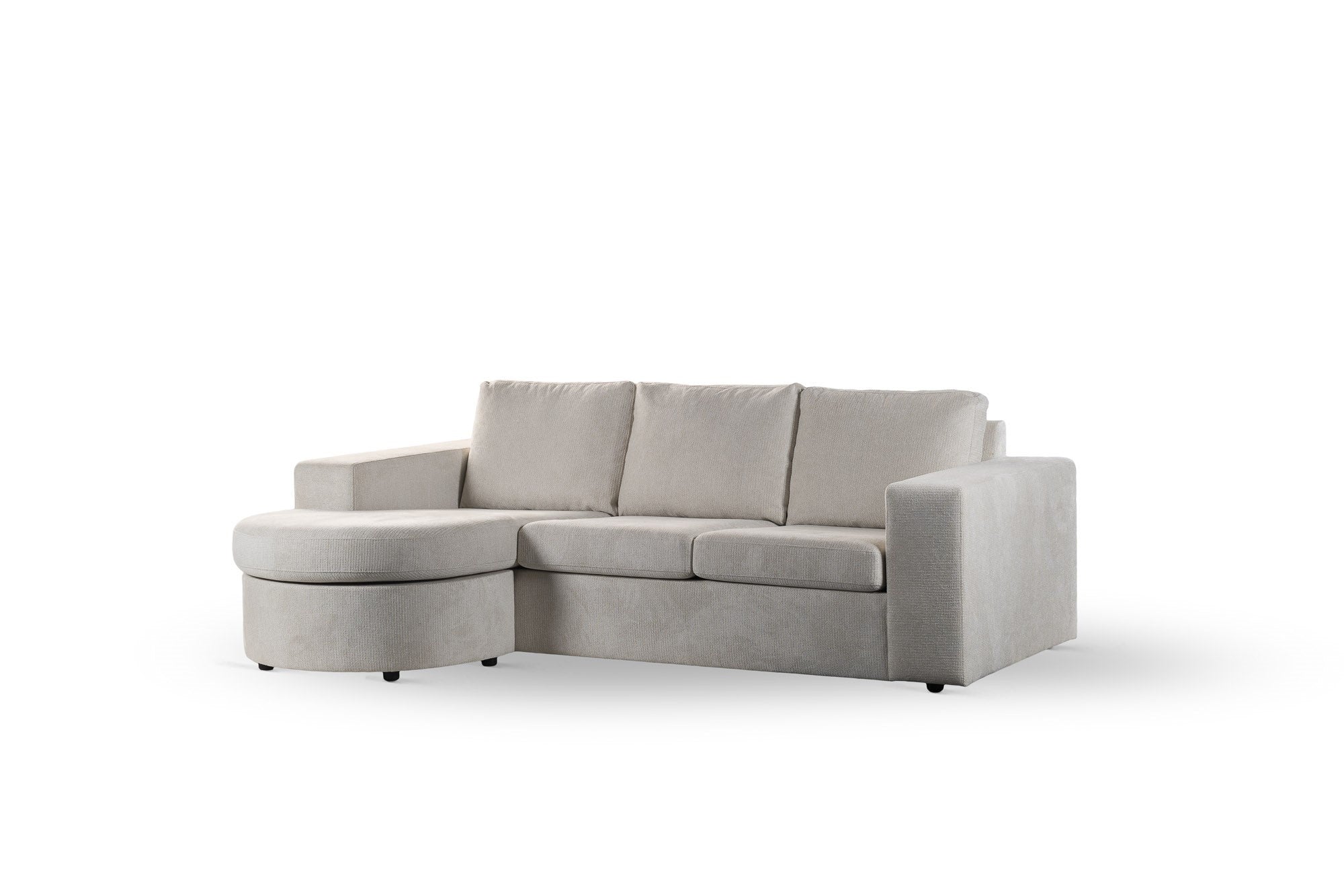 Looking for the perfect combination of Scandinavian and modern design for your living room? Meet our 3-seater corner sofa Jean in a beautiful light beige fabric, suitable for both left and right in your interior, OmdaT the chaise longue can be placed on both sides. With a width of 227 cm and a height of 83 cm, this corner sofa offers enough space to relax and enjoy cozy evenings. The light color of this corner sofa provides a fresh and trendy look, perfect for lovers of a minimalist and contemporary design. The seat width of 178 cm and 57 cm seat depth offer comfortable space to plop down after a long day. The 45 cm seat height ensures an ergonomic sitting position and makes this corner sofa ideal for long evenings relaxing. A unique feature of the 3-seater corner sofa Jean is the longchair with a round shape, which ensures a playful and contemporary look in your living room. The combination of functionality and style makes this corner sofa an indispensable addition to your interior. In short, with the 3-seater corner sofa Jean you get a Scandinavian and modern piece of furniture that creates a serene atmosphere and a timeless look. Be inspired by this beautiful corner sofa and give your living room a contemporary upgrade!