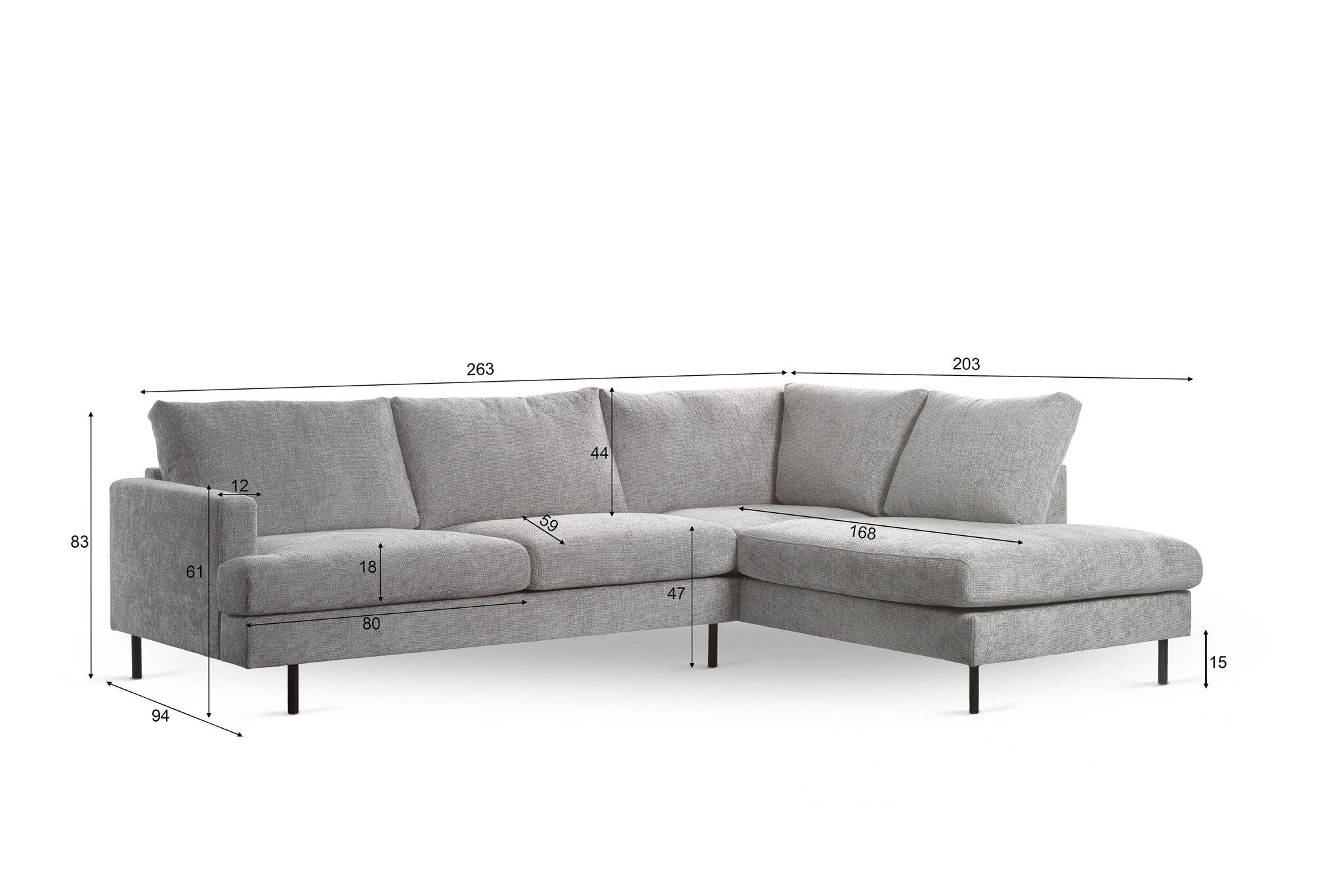 Looking for a modern and chic addition to your living room? Then the 3-seater corner sofa Nevada in fabric is a perfect choice. With a width of 262 cm and a depth of 206 cm, this corner sofa offers enough space for three people to sit comfortably. The seat, with a thickness of 18 cm, has a luxurious look thanks to the wing in the fabric and the light shine that gives the whole an elegant touch. The corner sofa is executed in the color beige and has black metal legs that ensure a modern accent. With a seat depth of 218 cm and a seat height of 47 cm, this corner sofa is not only stylish, but also extremely comfortable. The seating spots are spacious with a seat depth of 59 cm, which guarantees relaxed sitting. The Nevada corner sofa is available in two colors and available with the corner to the left and right, so that the sofa fits in almost every living space. With its contemporary design and high-quality finish, the 3-seater corner sofa Nevada is the perfect choice for those looking for a stylish and comfortable seating area. Invest in luxury and comfort with this beautiful corner sofa for an upgrade of your interior.