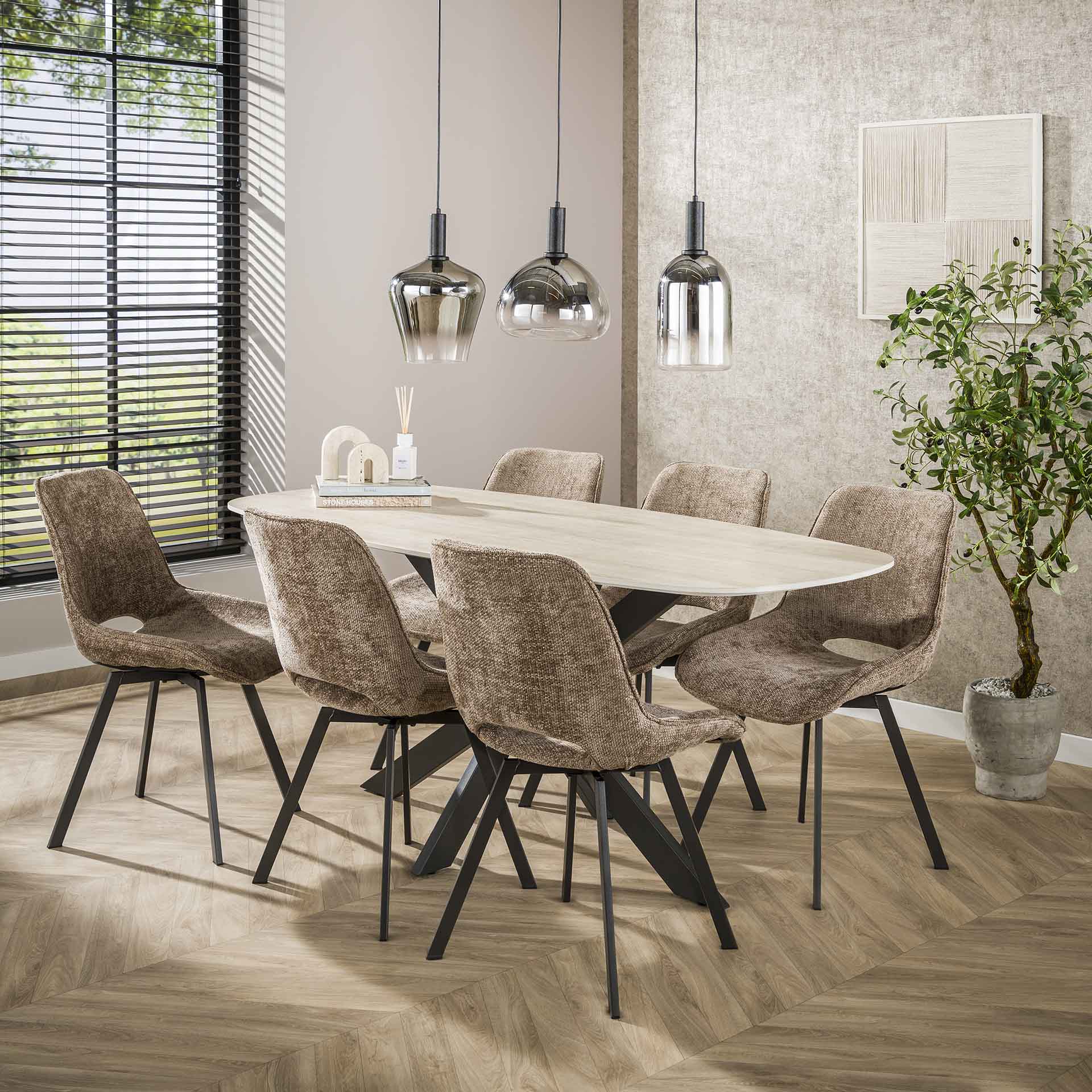 The Aureo oval dining table is a stylish eye-catcher for the modern dining room. With a slim, oval top measuring 180 x 90 cm in 3D ceramic travertine, this table combines a natural stone look with the practical advantages of ceramic: colorfast, scratch- and stain-resistant, and easy to maintain. The solid base provides stability and a calm, timeless appearance that complements both Scandinavian and industrial interiors.