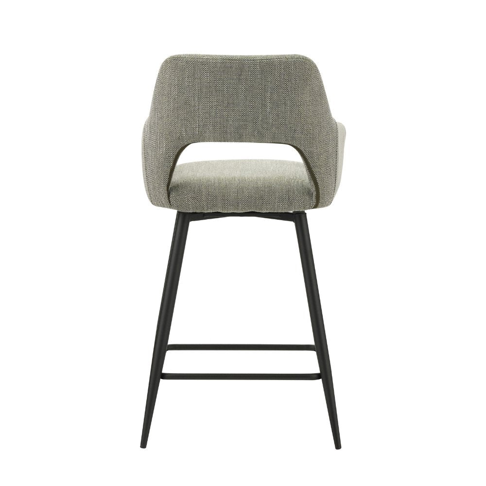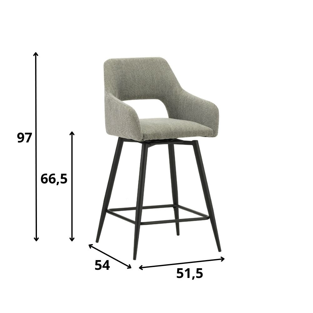 The swivel bar stool Skye is a trendy bar stool made from a sturdy, coarse woven fabric. The black metal frame ensures that the stool is solid and stable. The seat of the bar stool is upholstered with a fabric that feels durable and is easy to maintain. The design offers optimal seating comfort due to the backrest and armrests. The bar stool Skye has a seat height of 66.5 cm. Lower, fixed bar stools with a seat height between 60-67 cm are also known as counter stools and are very suitable for a kitchen island, bar, or table with a height of 90-95 cm. Furthermore, the bar stool Skye is 180 degrees swivelable, ideal for an evening of drinks at home or in a bar.