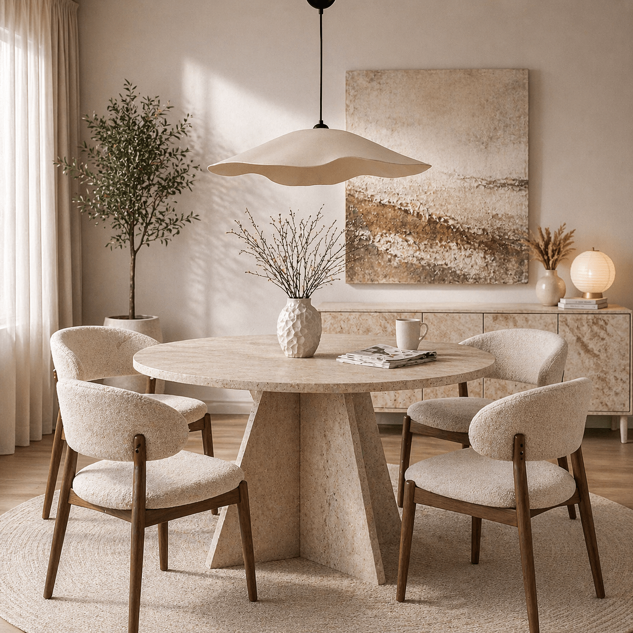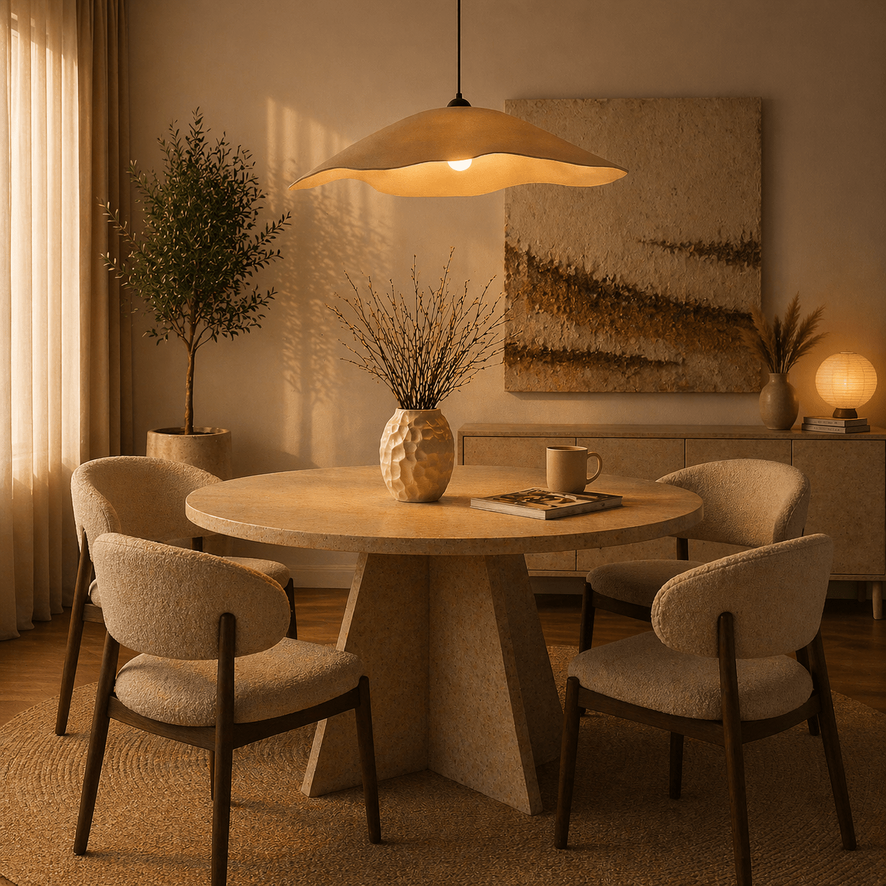 De combinatie van zachte crèmekleuren en warme goudtinten creëert een verfijnde en rustige sfeer. De carbonbeton kap voegt een moderne twist toe, waardoor deze lamp perfect past in zowel eigentijdse als klassieke interieurs.