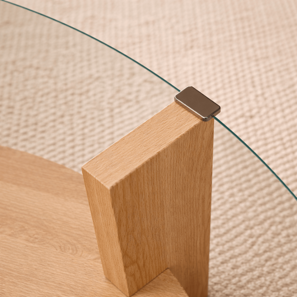 The combination of Sapphire Oak tint and transparent finish provides a playful contrast that immediately catches the eye. Its slim design takes up little space while still serving as a reliable focal point for coffee, magazines, and cozy conversations. This furniture guarantees a calm, inviting atmosphere in any living room.
