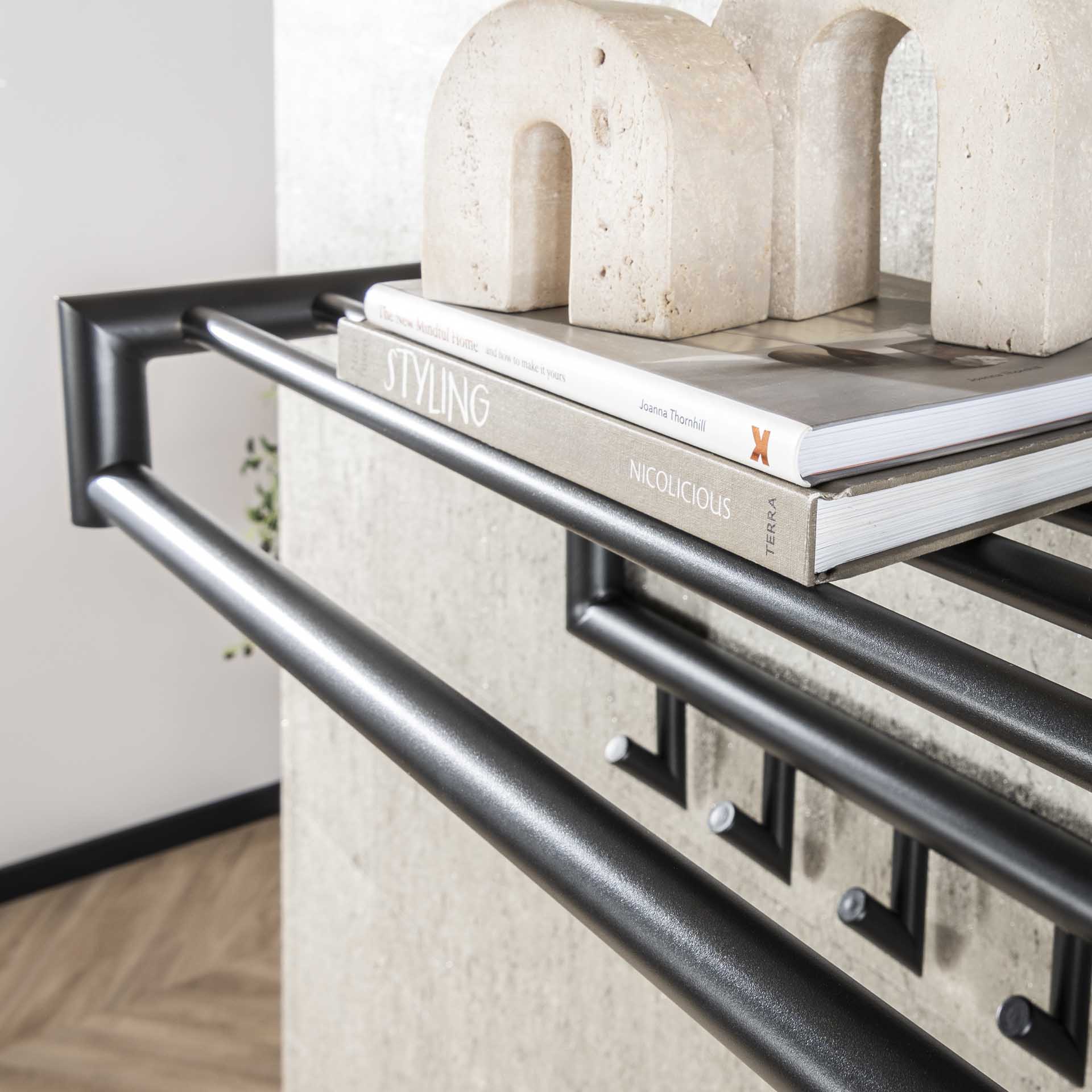 Practical, stylish, and sturdy: Coat rack Kym is a perfect addition to any hallway or entrance. This coat rack is made of dark gray, matte powder-coated steel and features a sleek design with a round tube construction. The hat shelf consists of multiple round tubes and provides extra space for accessories such as hats, bags, or scarves.