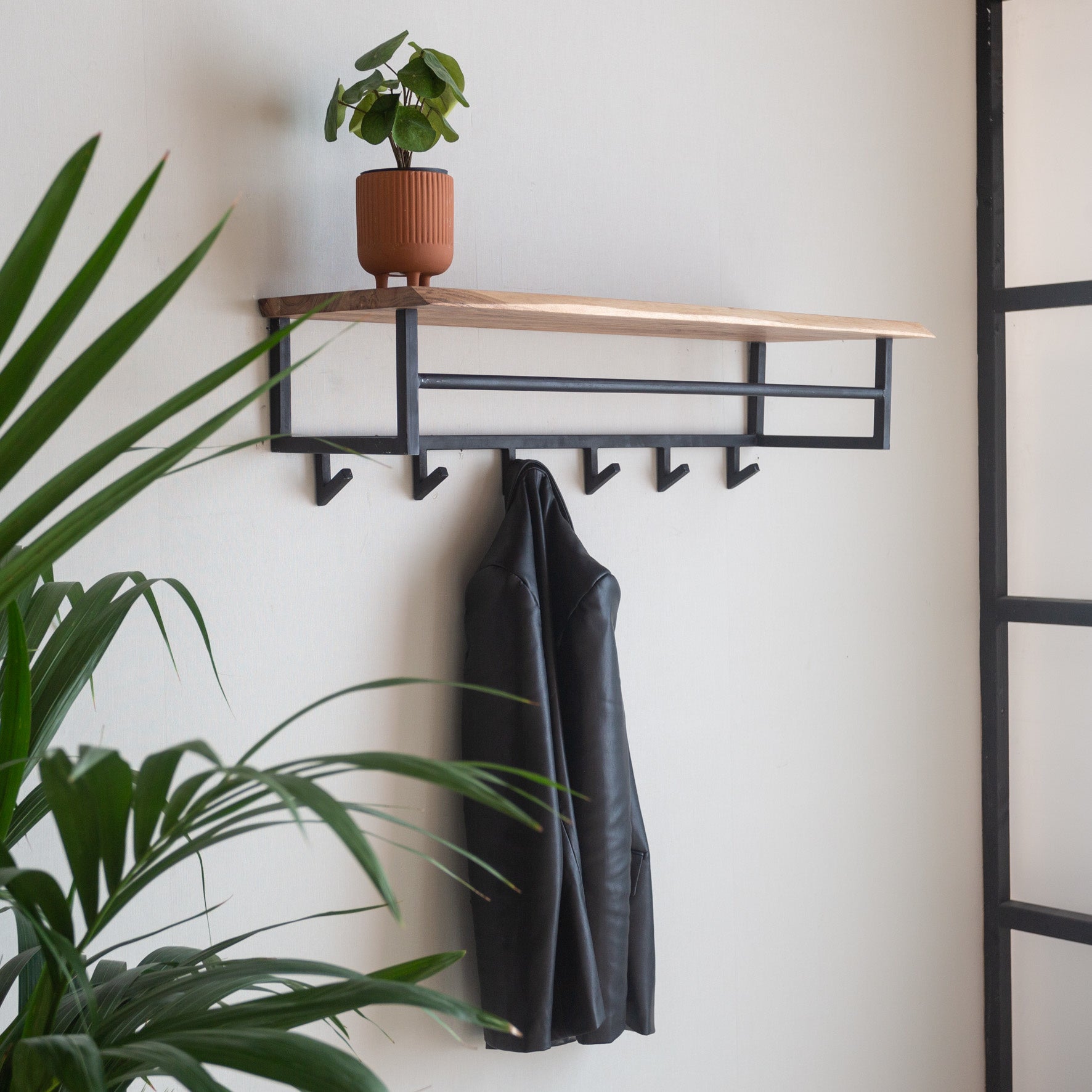 Industrial Niels Coat Rack 6-Hook Acacia Wood - With Hat Shelf