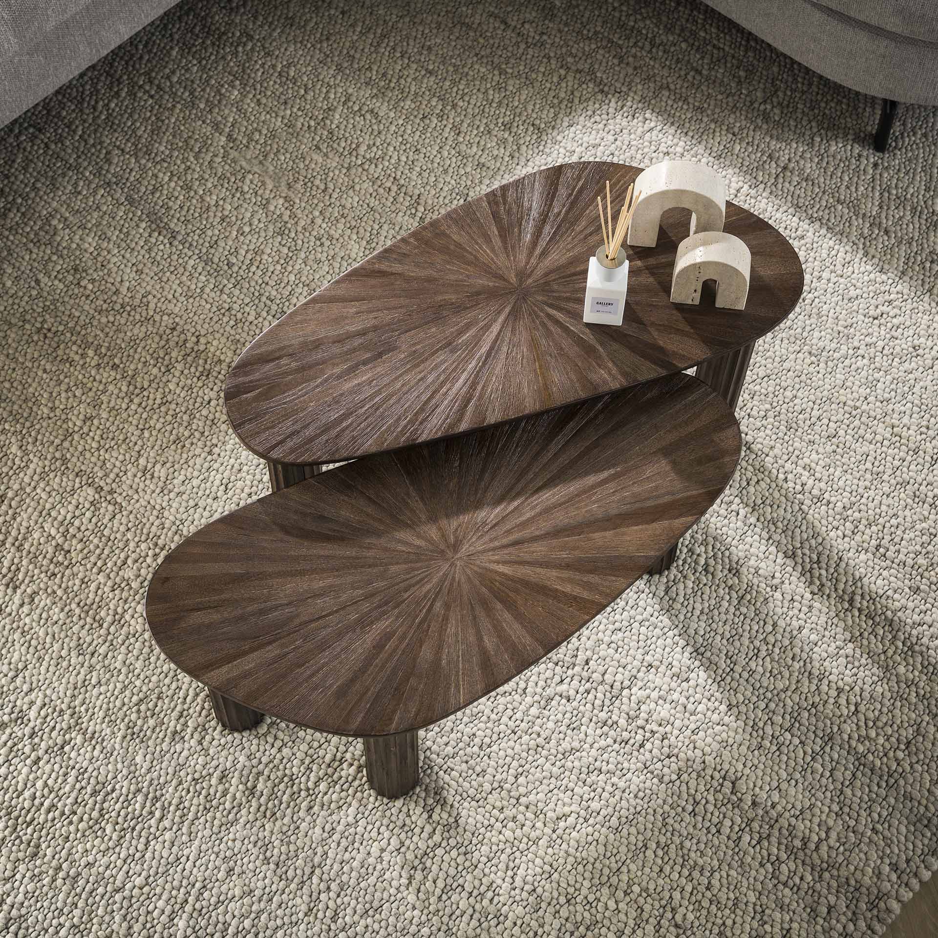 Bring natural elegance to your interior with the Myla coffee table set. This set of two tables is designed in a soft, organic shape and made from high-quality teak wood with a rich dark brown finish. Sustainable, stylish, and timeless design. The beautiful wood grain and the unique legs with a refined wave pattern give the tables a unique, stylish appearance.