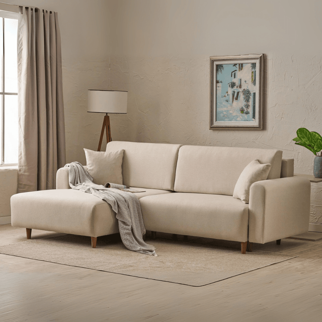 Corner sofa with sleeping function on the left mane cream
