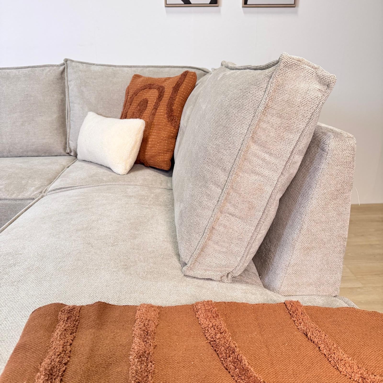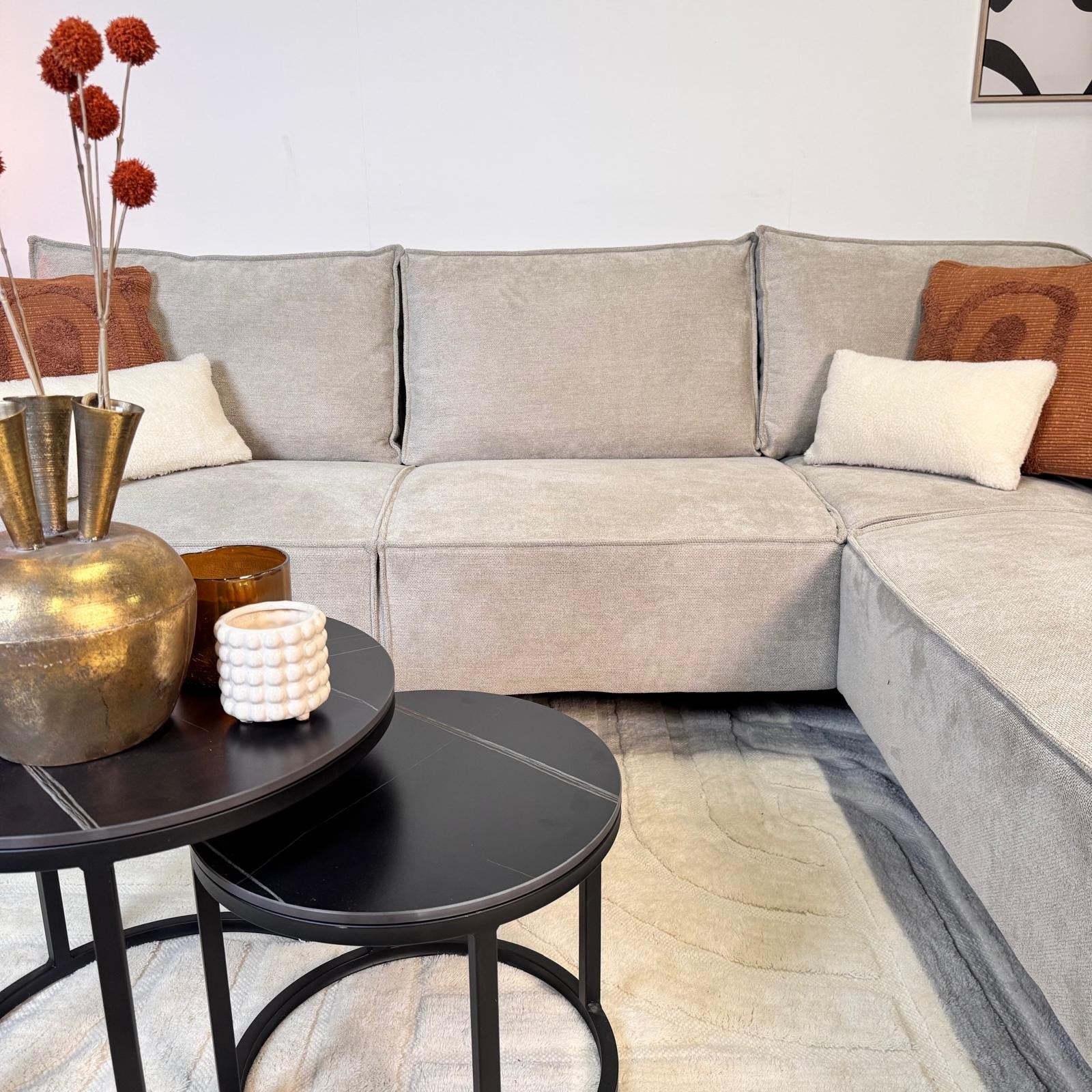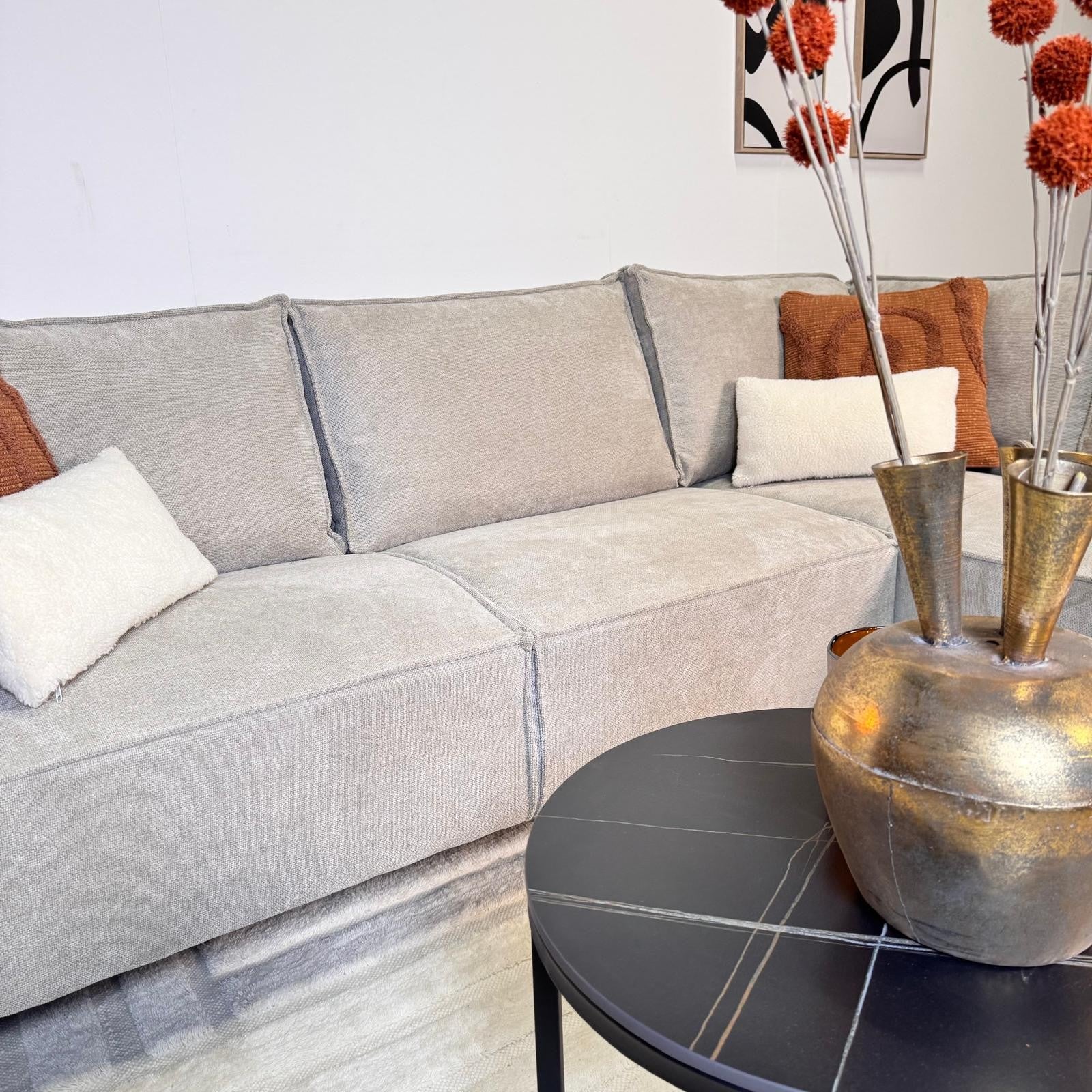 The Yara Corner Sofa is upholstered with a soft and durable chenille fabric in a beige color. You could also call the color warm gray, or greige; a gray overtone with a taupe undertone. Chenille is known for its comfortable and luxurious feel. The fabric gives the sofa a rich, soft texture and a slightly shiny finish that adds a touch of luxury to your interior.