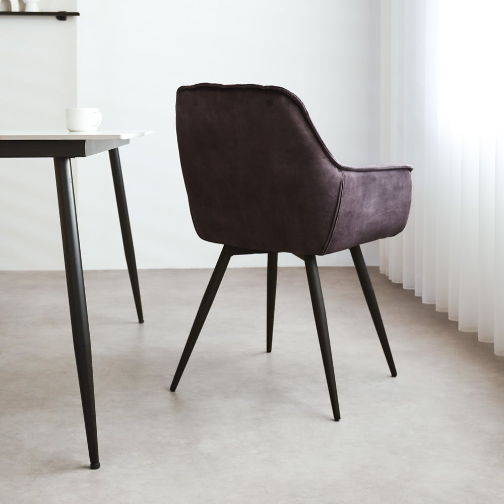 The dining chair is upholstered with velvet. Velvet is a type of fabric that originated in Asia and made its way to Europe around 1400. In velvet, small loops are woven, creating a soft, shiny fabric on the surface.