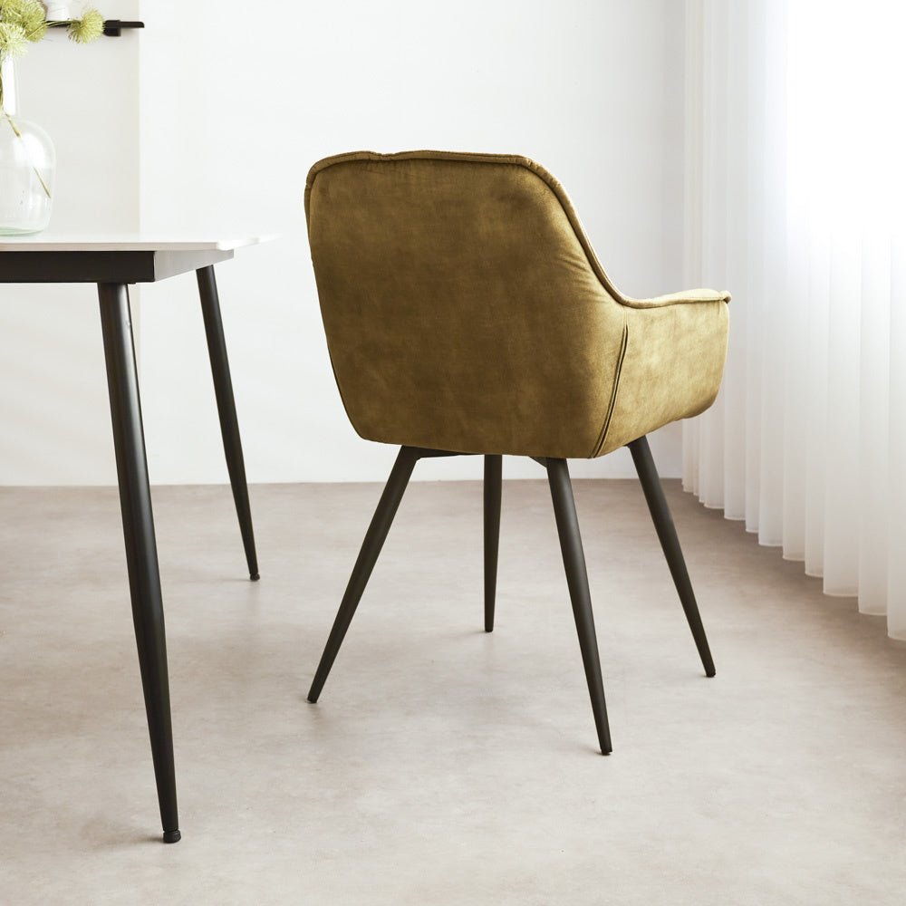 The dining chair is upholstered with velvet. Velvet is a type of fabric that originated in Asia and was brought to Europe around 1400. In velvet, small loops are woven, creating a soft, shiny fabric on the top.