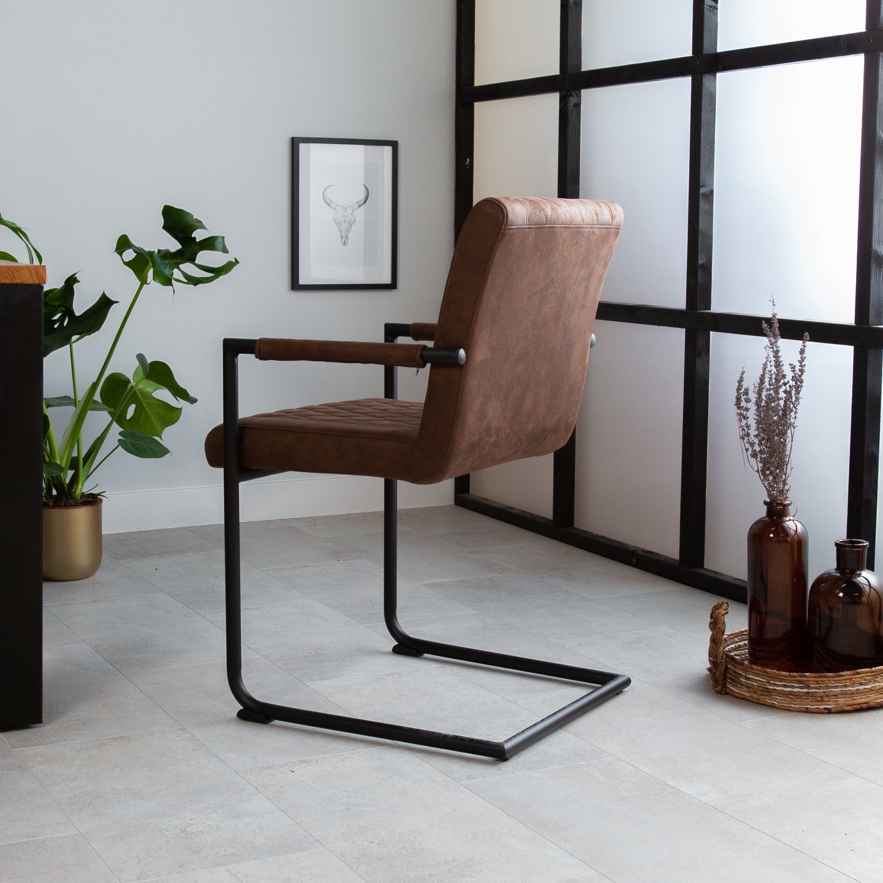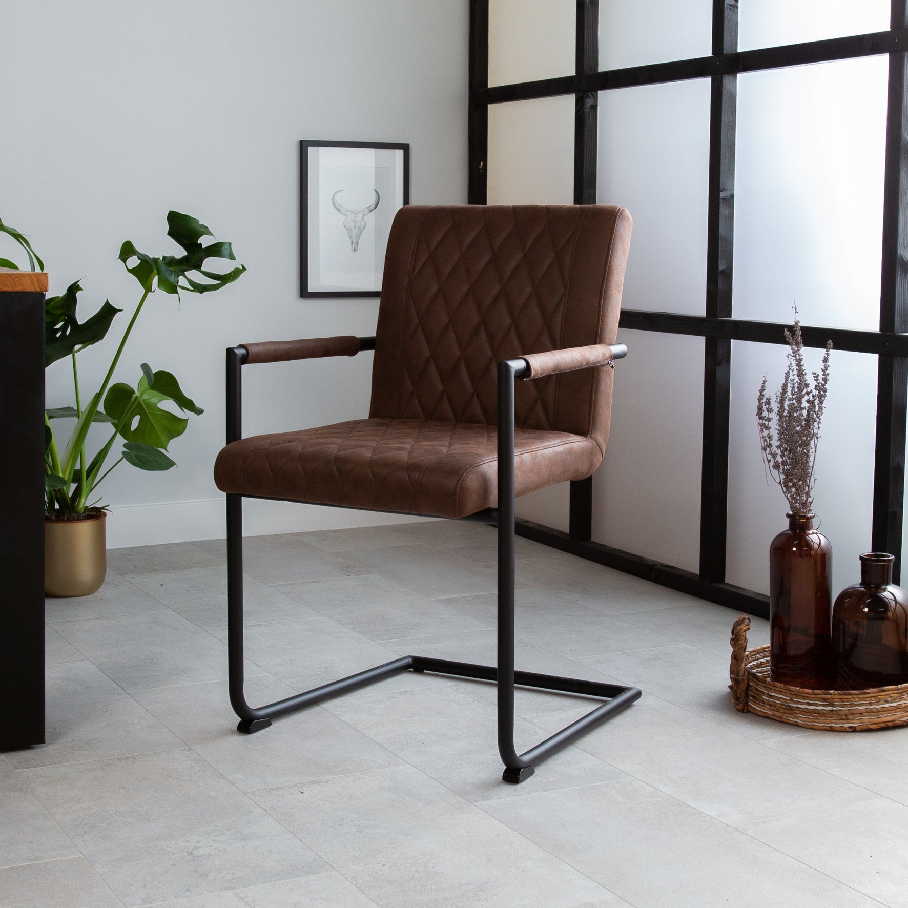 The Dean is a sturdy dining chair with a classic check pattern that fits perfectly within an industrial interior. The perfectly proportioned dining chair has a vintage look-and-feel and will give your interior the charm of a chic loft. The Dean dining chair is available in the colors brown, cognac, taupe, and anthracite. The colors are all coordinated, making them easy to combine with each other!