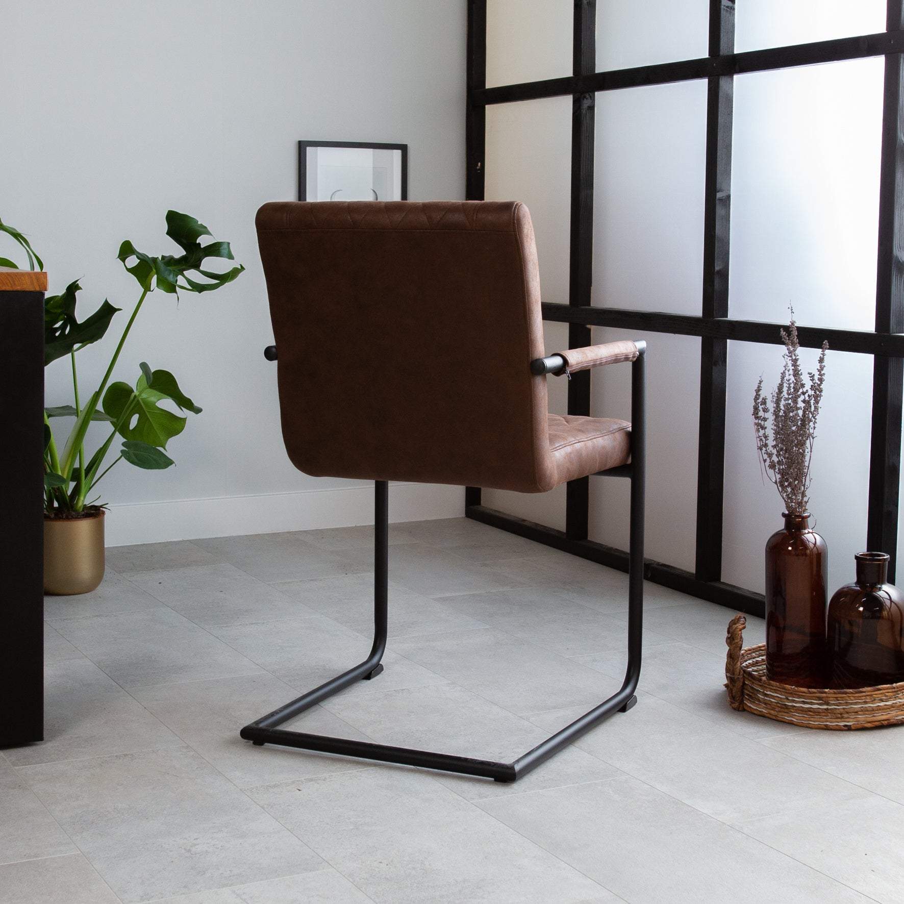 Industrial dining chair Dean brown is a sight to behold in many interiors. This stately dining chair features a microfiber seat with a rugged black powder-coated metal frame.