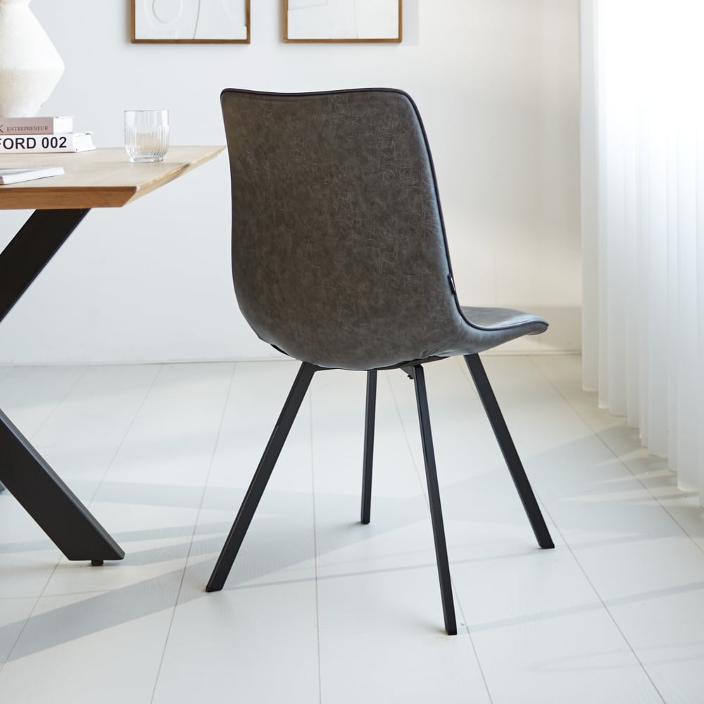 The beautiful supple artificial leather provides a modern, stylish, and timeless appearance. The black metal frame adds a rugged touch. A trendy dining chair with high comfort.