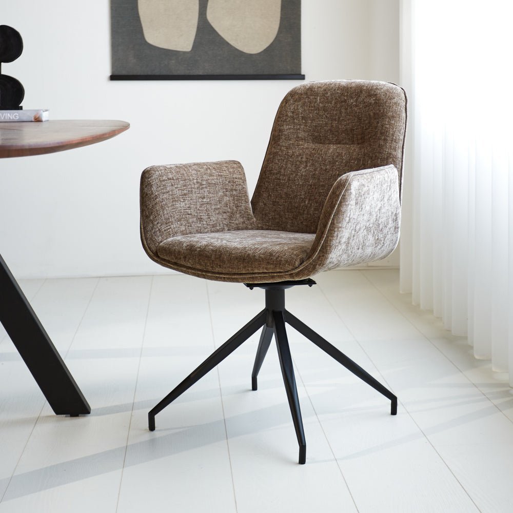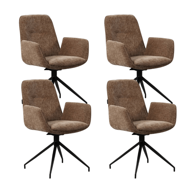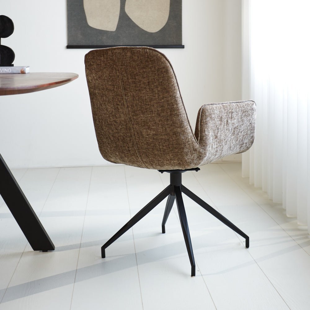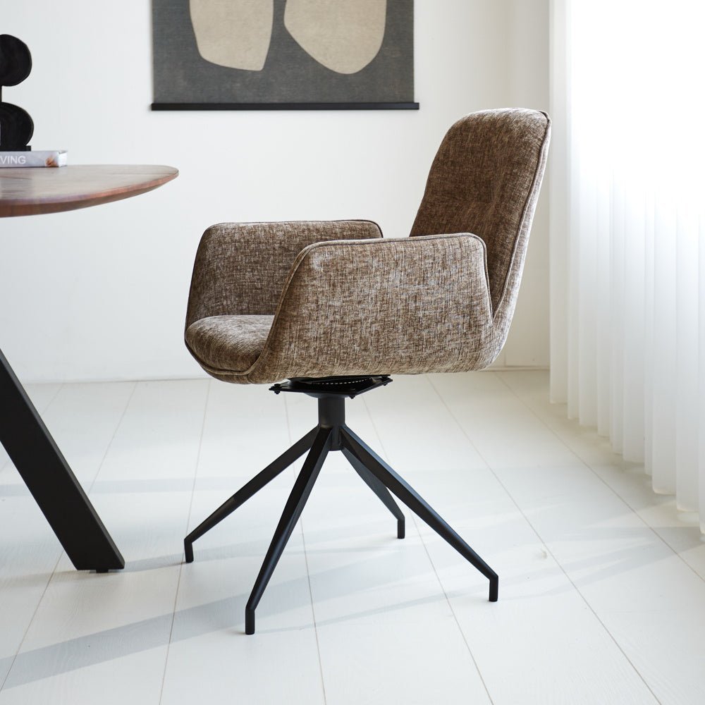 A soft chair with a slight sheen that is also swivelable? That is the dining chair Nela. The dining chair is upholstered in a trendy and soft chenille fabric. Chenille is made from chenille yarns that consist of polyester. The fabric gets a chic appearance due to the sheen. Chenille fabric resembles velvet because of its shine. Additionally, chenille is extremely durable and easy to maintain. Perfect for a dining chair, then. Nela is not only stylish but also offers high seating comfort. This is mainly due to the high backrest, the armrests, and the soft fabric. Enjoying long meals is no punishment with this stylish dining chair Nela.