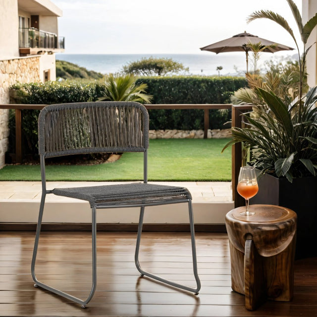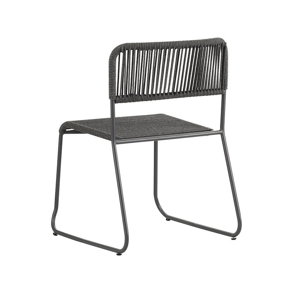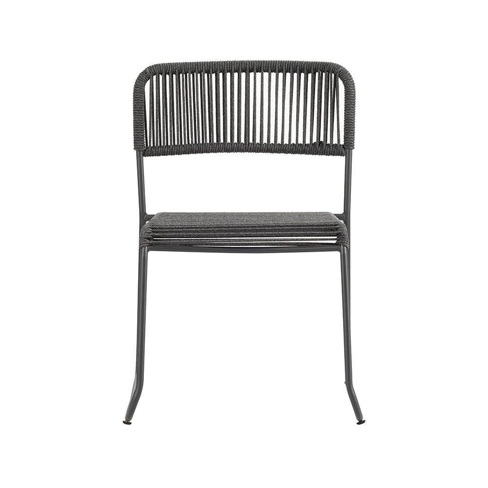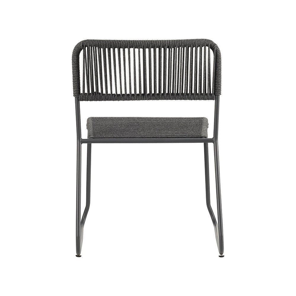 This dining garden chair is made of gray metal in combination with polyester. The rope is braided around the backrest and seat looks stylish. The advantage of polyester rope is that this is ideal for outside seats. The rope will dry quickly after a rain shower. Maintenance