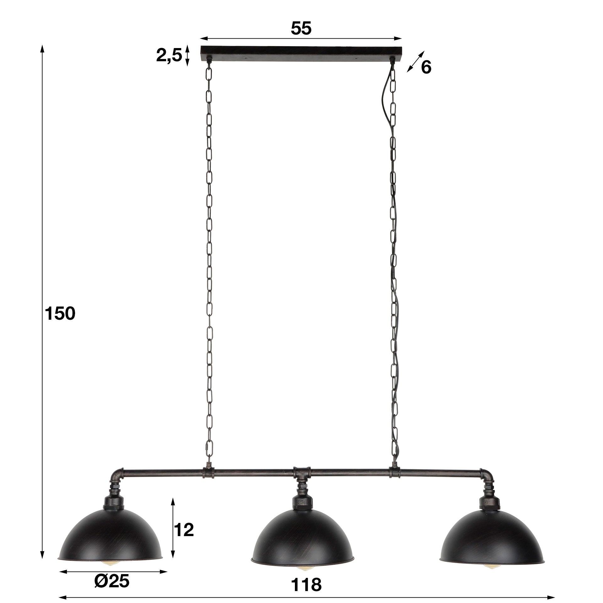 Hanging lamp Abby is made of water pipes and consists of three black, half open lampshades. The complete lamp hangs on one ceiling confirmation through metal chains. The ceiling attachment contains the same color as the lampshades. Given the size of this lamp, the Abby fits perfectly above a medium-sized dining room table. Light source