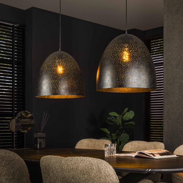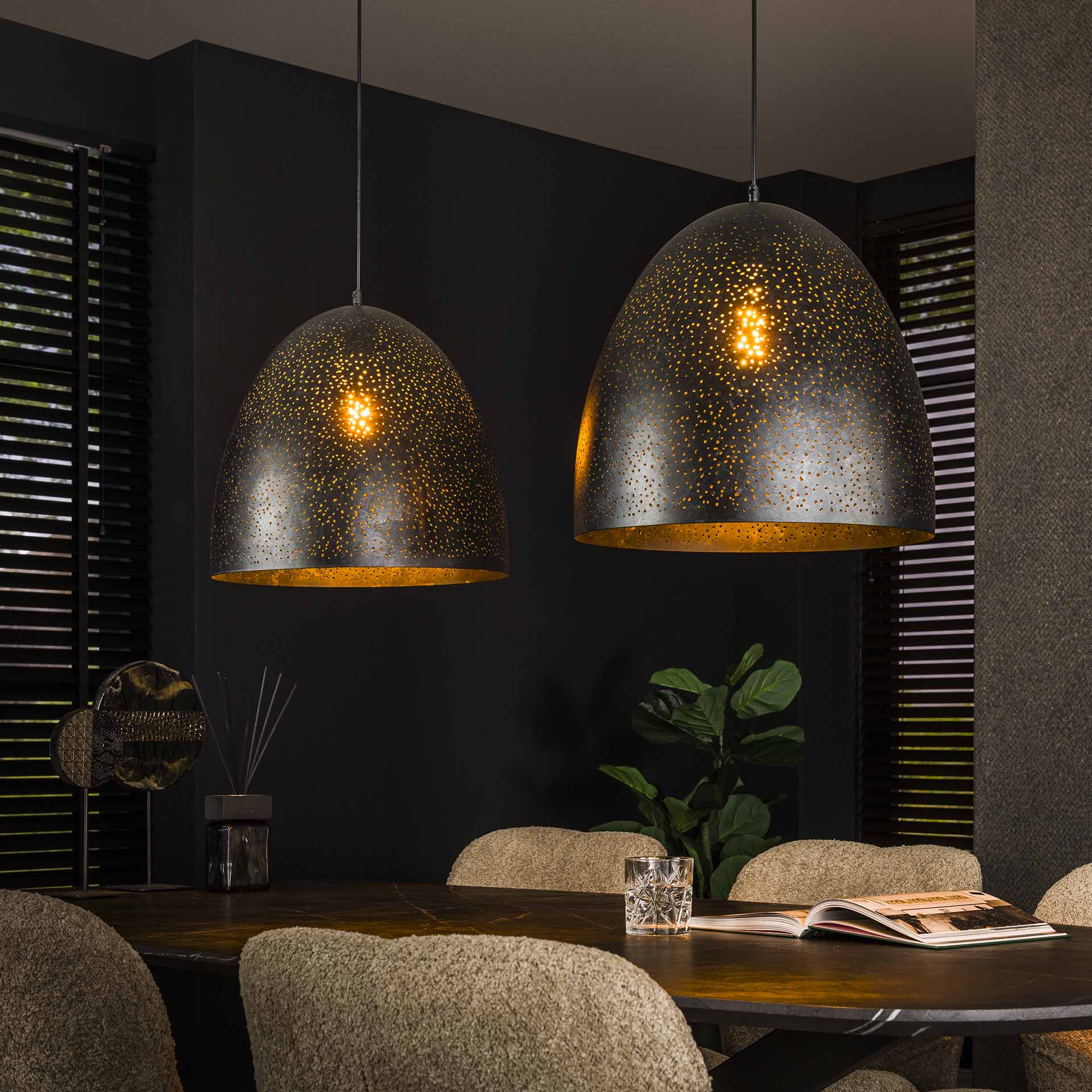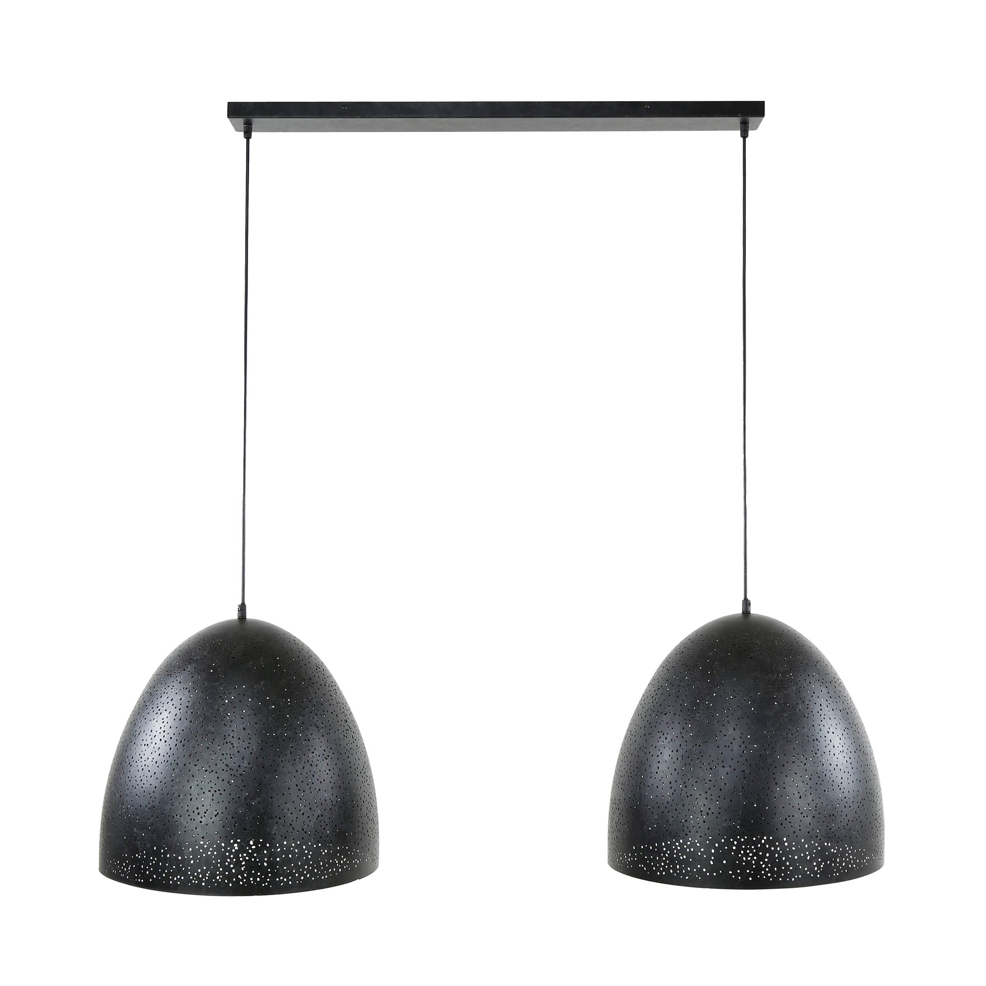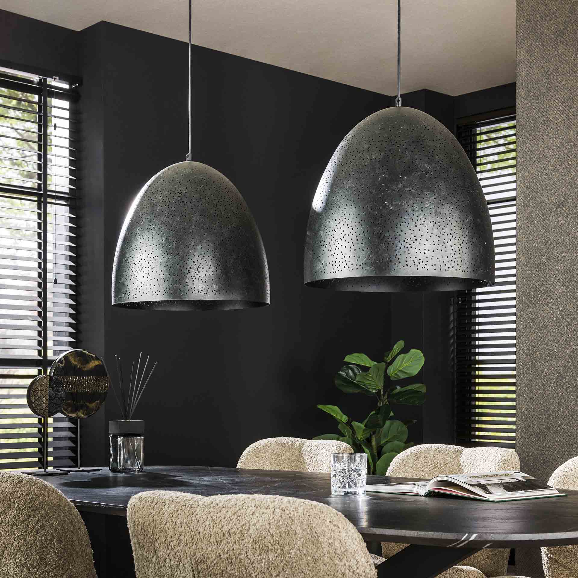 The industrial hanging lamp Kylian 2-light metal, executed in metal with a stylish Charcoal finish, adds a touch of character to every room. The handworked, etched holes ensure a beautiful dosed light spread. The hoods are adjustable up to 150 cm in height, so that the lamp can be used flexibly. For optimum use, an LED light source is recommended. Available in both 2 and 3-light versions, this lamp brings extra atmosphere to every house.