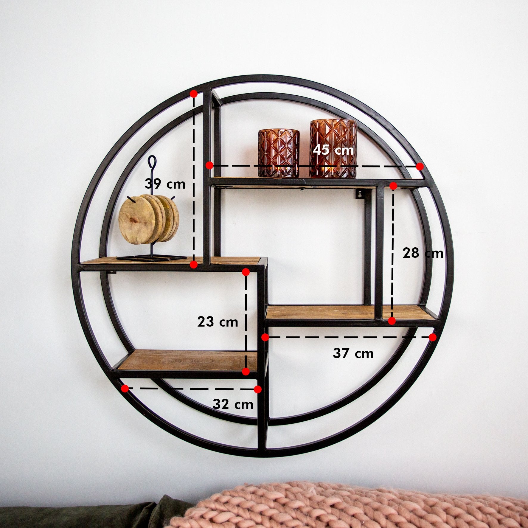 The frame of the round wall rack is made of metal. The black color in combination with the wood fits very well with contemporary interior trends and gives the rack its cool and industrial look.