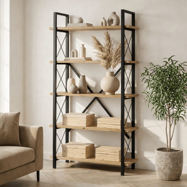 Industrial Bookcase Ely Atlantic Pinewood Melamine - Black Frame - 180x90 cm