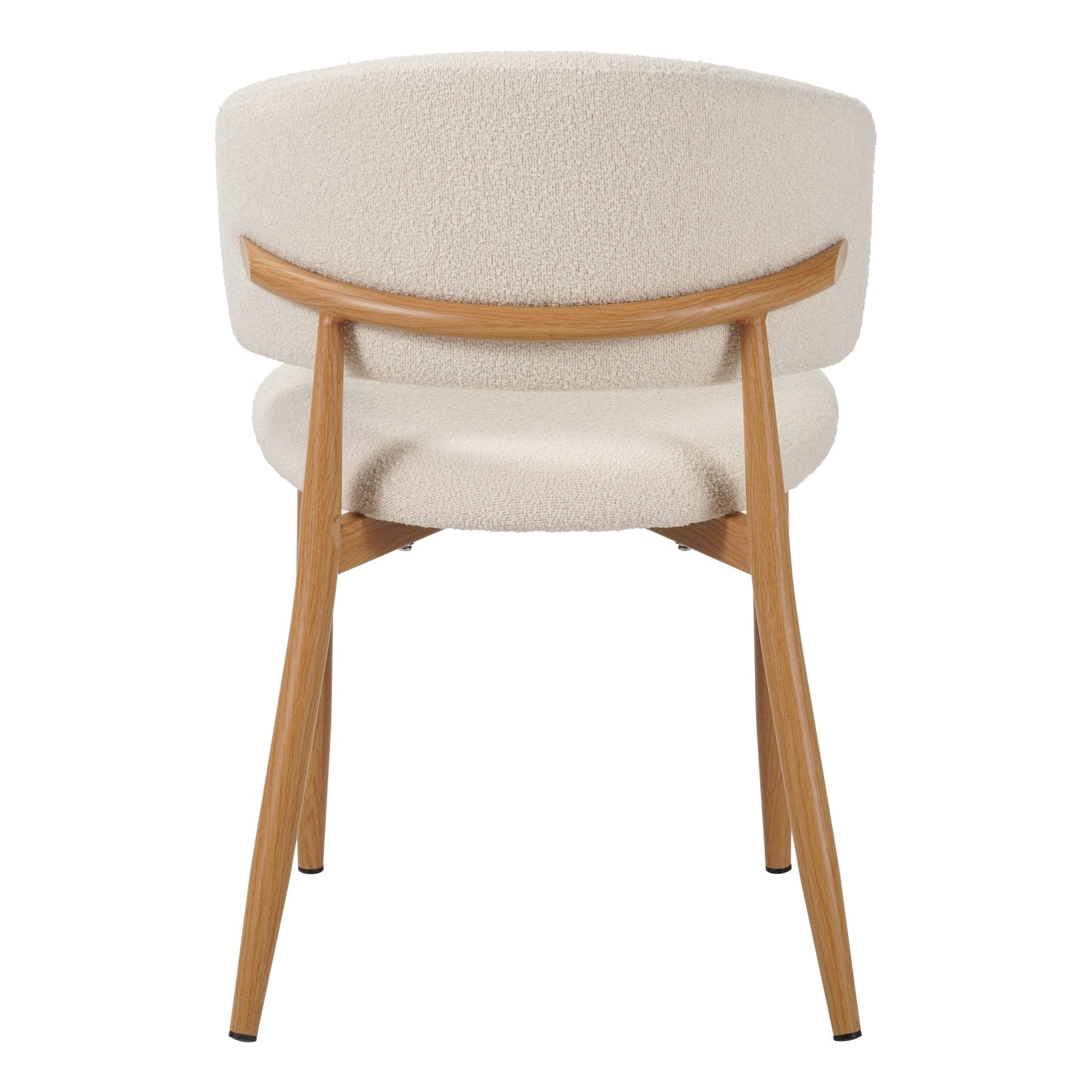 De Yuka eetkamerstoel is bekleed met een luxe bouclé stof, bekend om haar warme, wollige uitstraling en zachte structuur. De poten zijn gemaakt van metaal en afgewerkt met een realistische eiken houtlook, waardoor de stoel de perfecte balans biedt tussen stijl en stevigheid. De combinatie van zachte stof en natuurlijke tinten zorgt voor een tijdloze look.