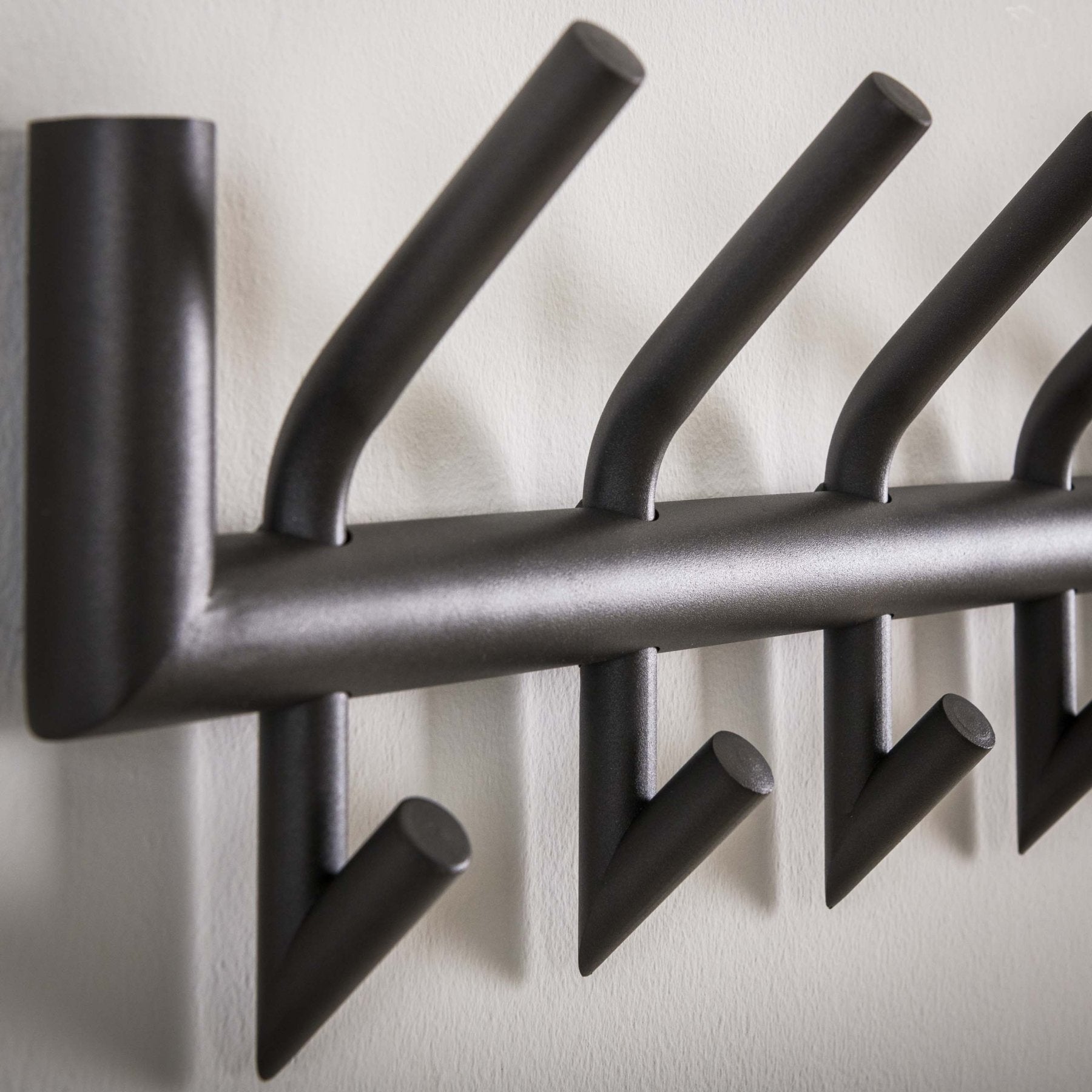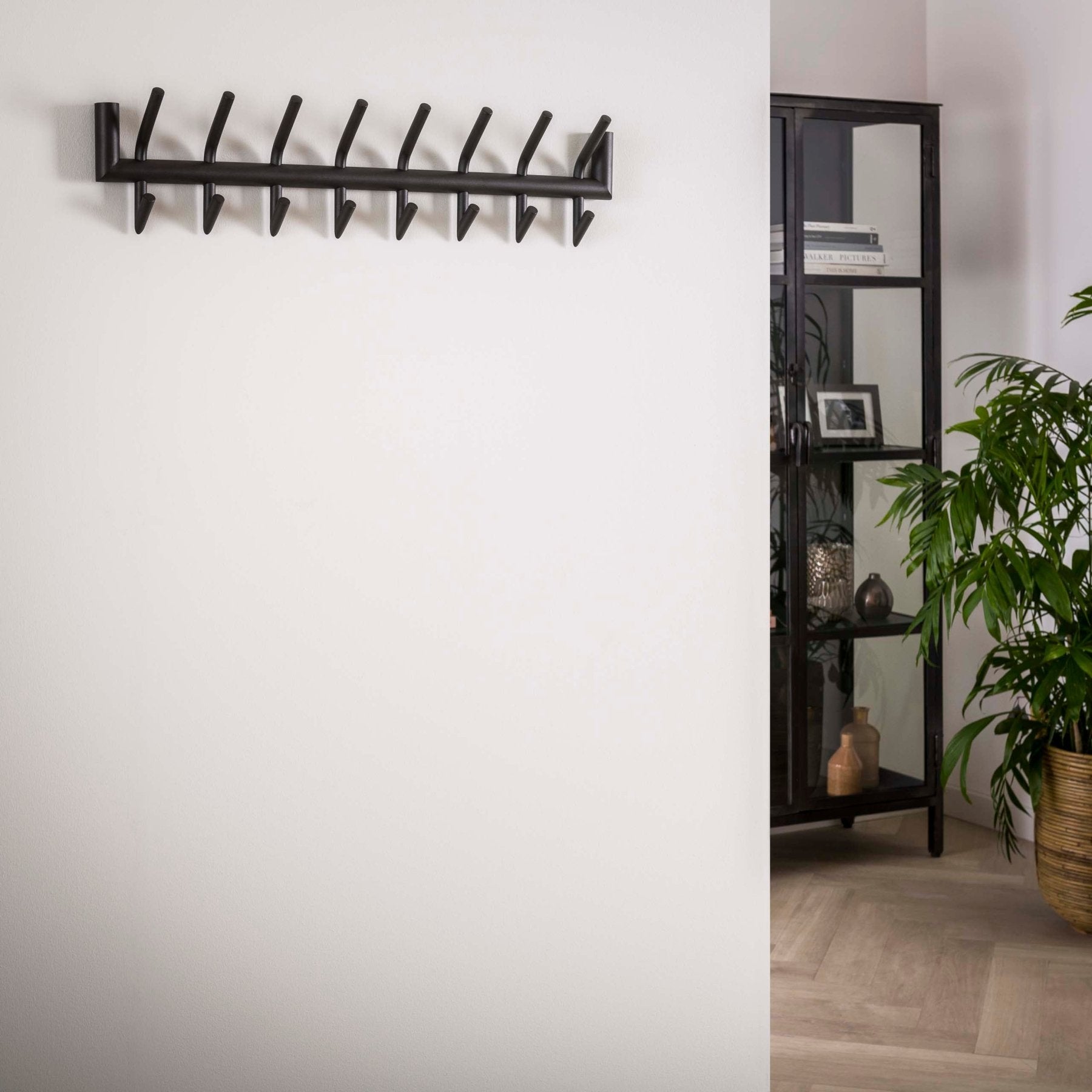 Met twee rijen haken creëer je overzicht: jassen boven, tassen en sjaals onder, of juist voor ieder gezinslid een eigen plek. De matte donkergrijze afwerking geeft een stoere, tijdloze look die moeiteloos past bij industriële, moderne en minimalistische interieurs. Dankzij het compacte ontwerp blijft er genoeg loopruimte over, zelfs in een smallere gang.