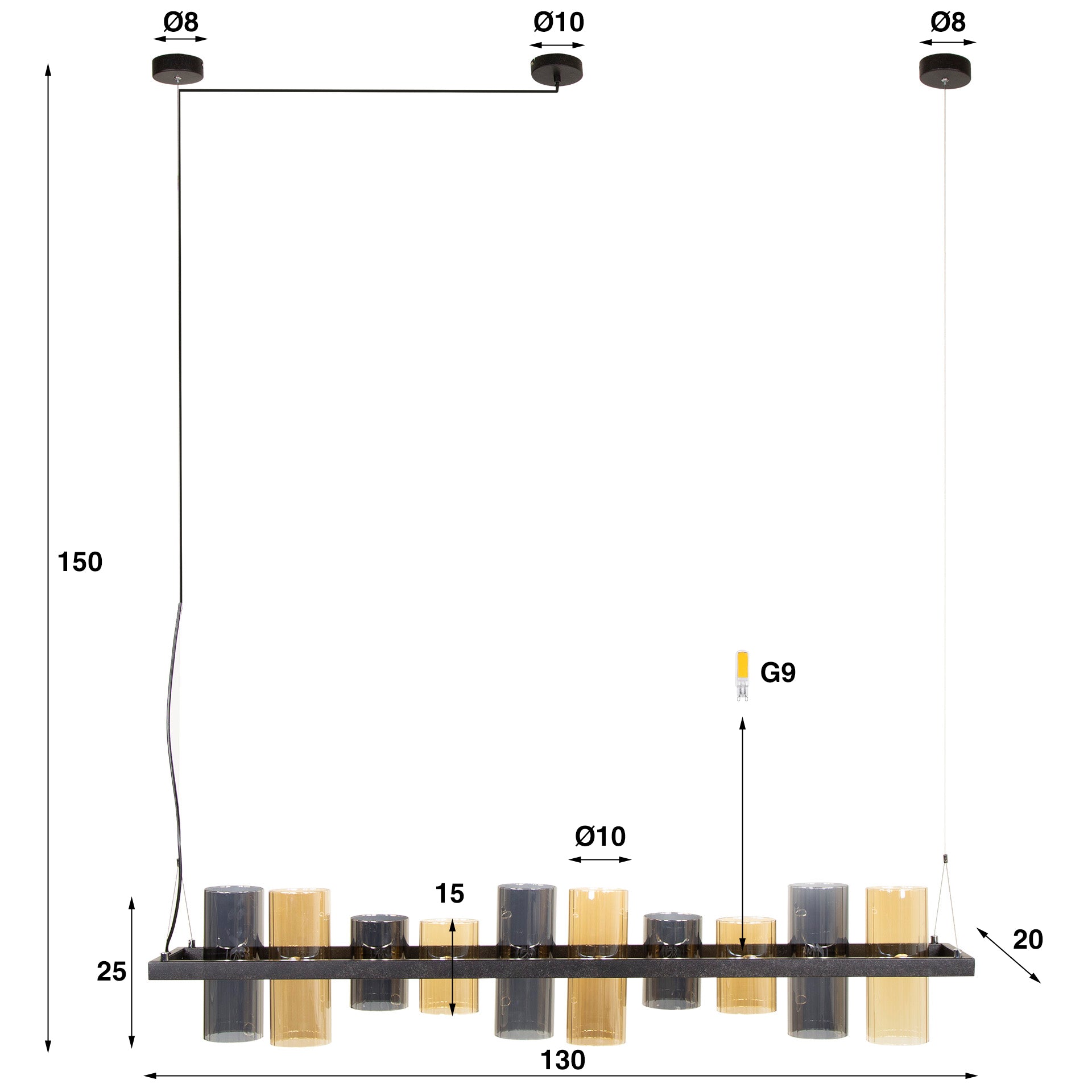 This beautiful hanging lamp Khai is equipped with 10 glass shades. The shades are finished in amber-colored and chrome-colored glass. The shades come in 2 different heights. The metal parts of the lamp are finished in an artic black finish. The lamp is adjustable in height up to 150 cm. This lamp also has 1 matching floor lamp and 1 matching hanging lamp.