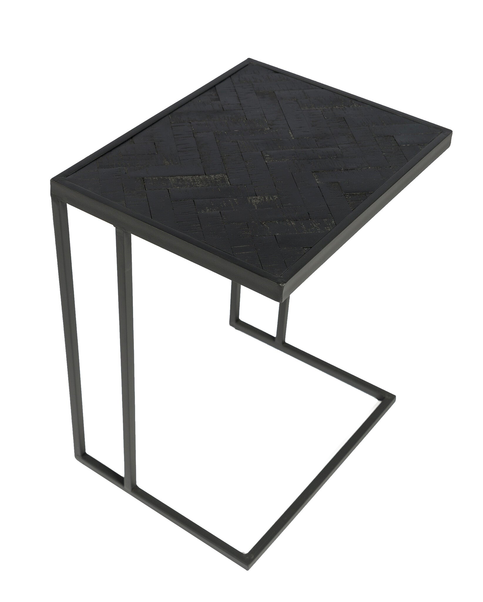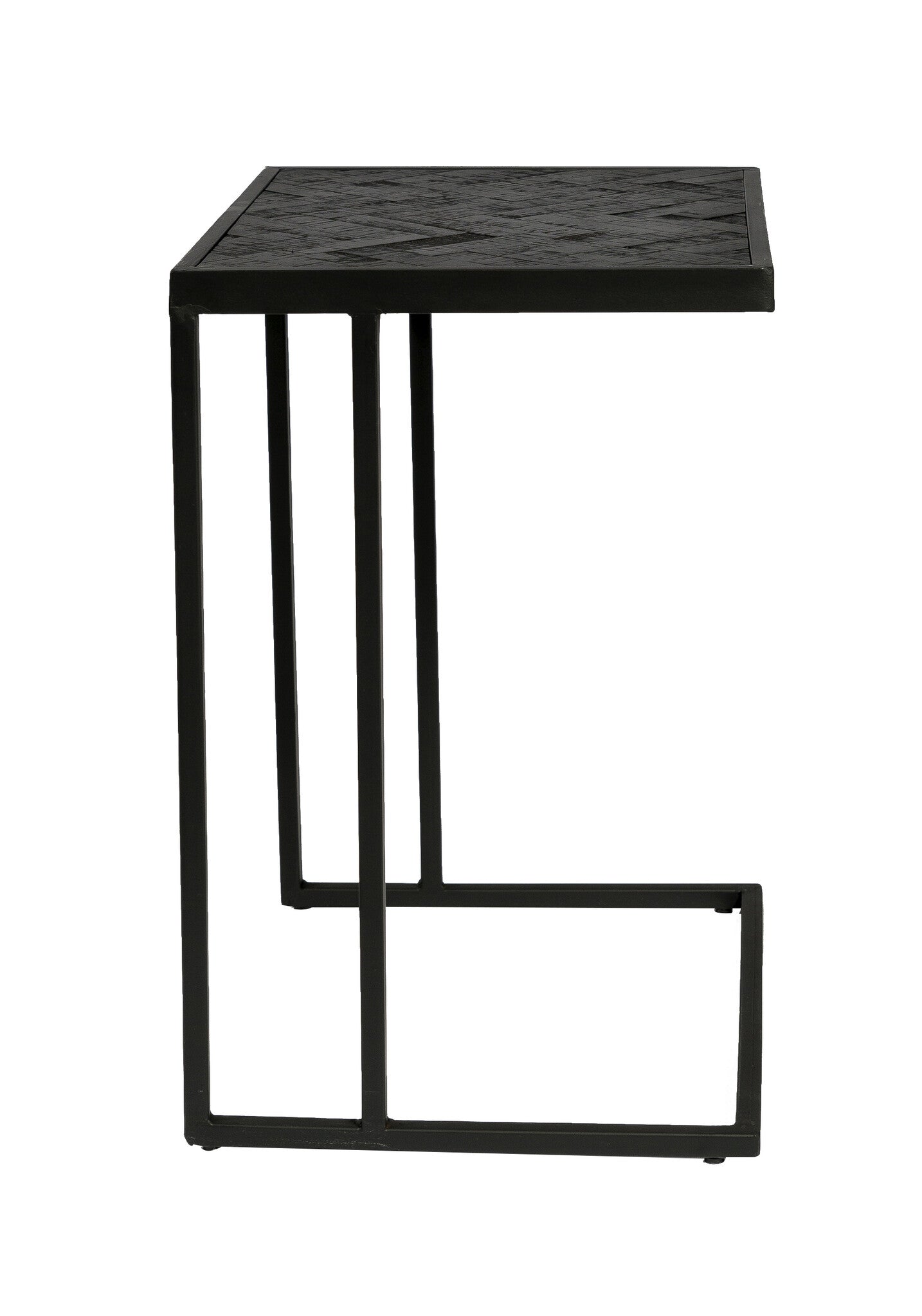 The laptop table top is black sprayed teak. Teak furniture is known for being in good condition after years. It is a sustainable wood that works relatively little after. The top is concealed within the frame and is therefore on a horizontal level with the top of the black metal frame. The top is structured with herringbone structure. Grooves are sharpened over the teak top that ensure that this laptop table gets a nice vintage look. These grooves are slightly gray.