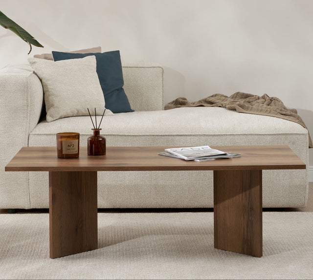 Sabin Walnut Coffee Table 119x60 cm Melamine. The warm walnut color and the sleek, modern design immediately create atmosphere in your seating area. Its compact profile makes it suitable for both spacious lounges and smaller rooms, where it maintains space for your favorite accessories.