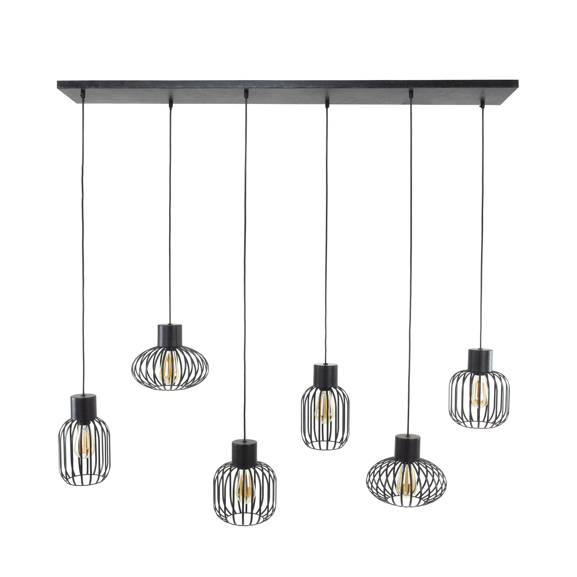 Hanging lamp Luise has an airy and playful design and contains six fittings that can be hung in various light sources. All lampshades are adjustable up to 150 cm in height to their own taste. Because of the Charcoal Finish and the Bois on which the lampshades hang, this lamp has an industrial touch. The hanging lamp fits above a small to medium-sized table.