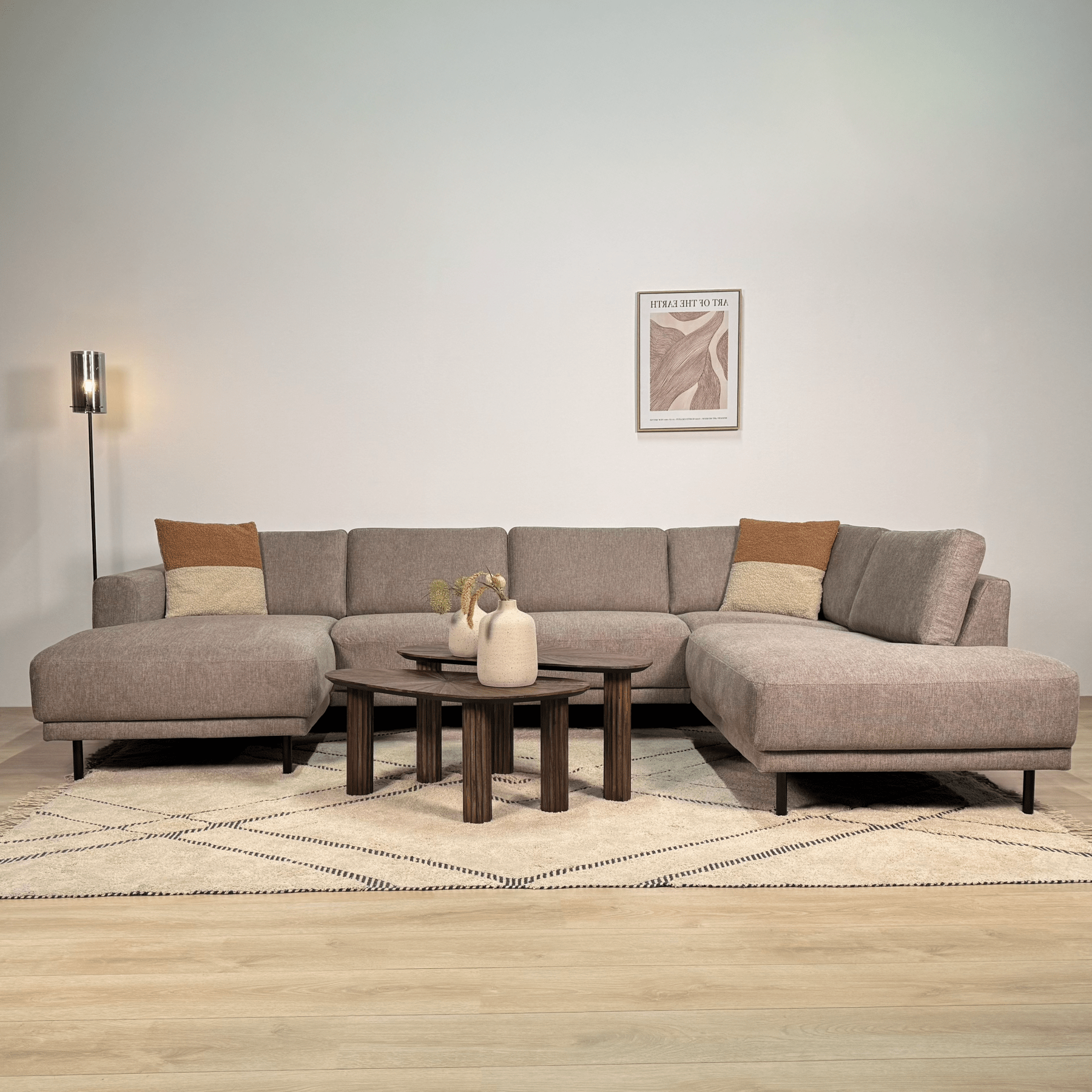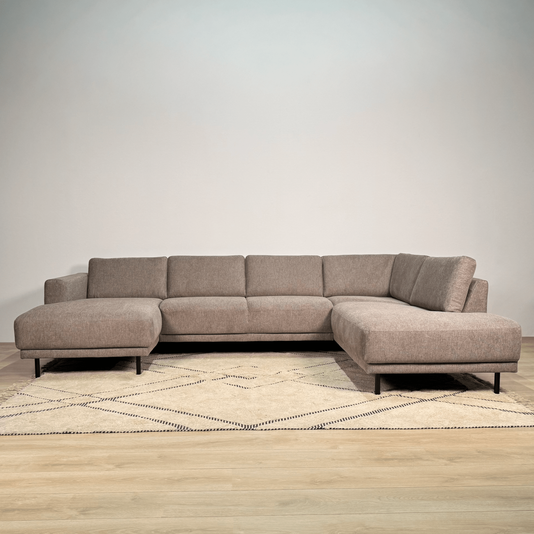 The Aniko U-shape corner sofa is the perfect choice for those who want to combine space with style. With generous dimensions and a comfortable lounge layout, this sofa is ideal for families or for those who like to entertain guests. The sleek lines and taupe fabric make this a timeless eye-catcher in your interior.