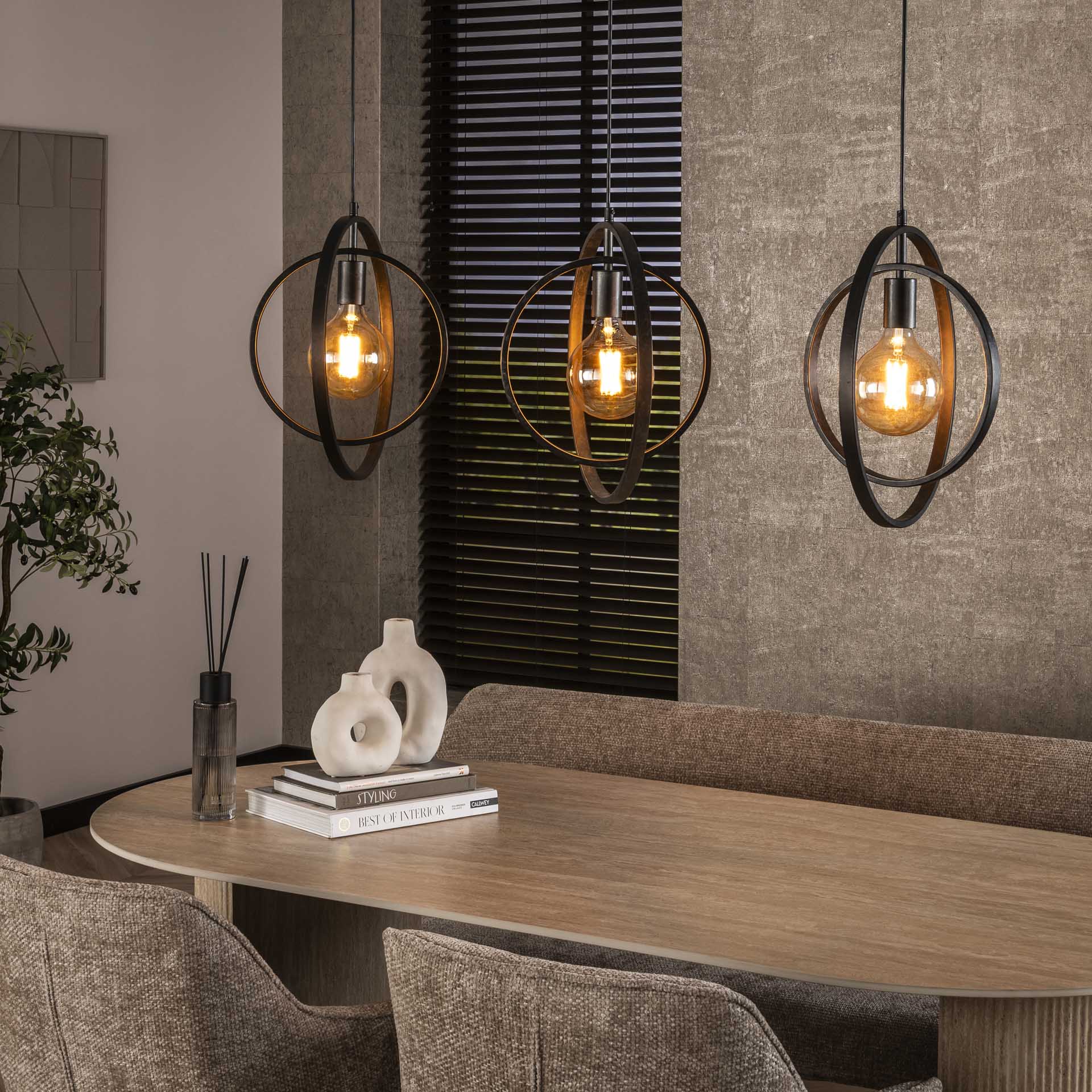 This industrial hanging lamp Otan contains three light points and is made of a round model. The outer circles are attached to the power cables, the inner circles can turn completely around and can be adjusted as desired. The hanging lamp is finished in Charcoal Finish and is a real eye-catcher in your living room or kitchen. The Otan hanging lamp is adjustable up to 150 cm in height. A suitable light source is a must-have; Thanks to the open fixture, the light is distributed by the room atmosphere.