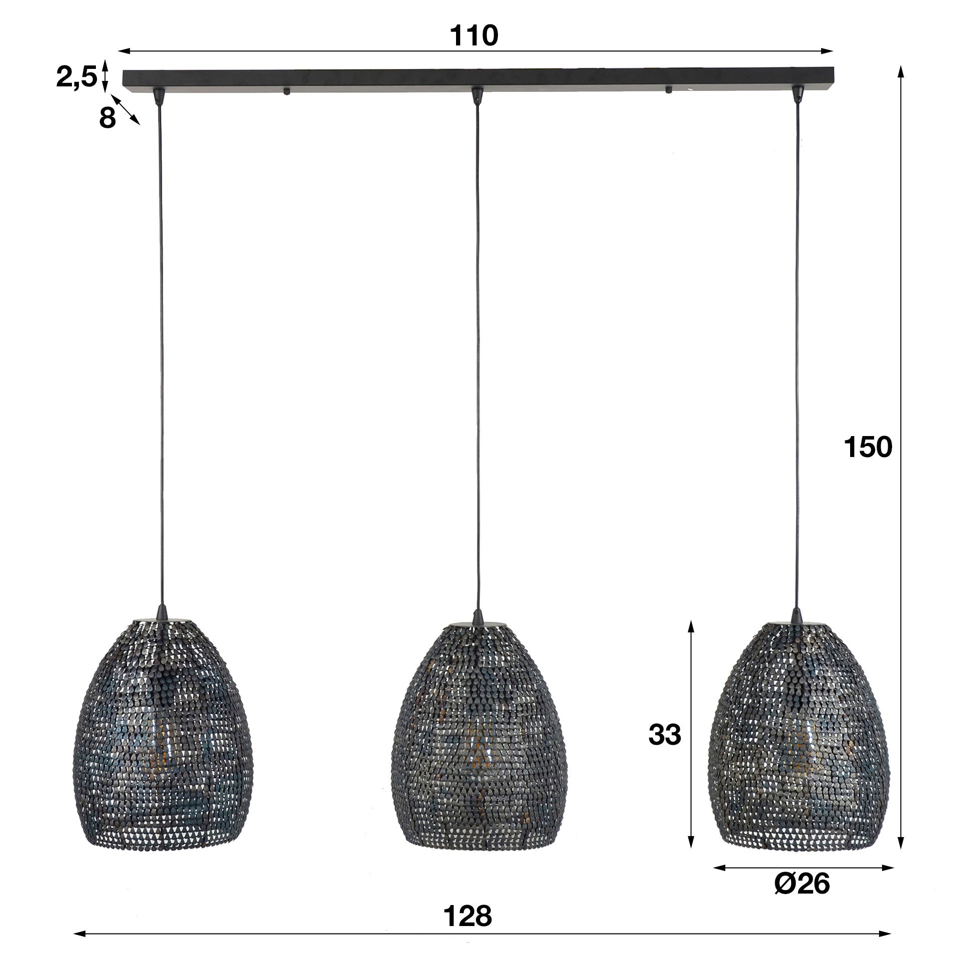 Hanging lamp Armor is easy to assemble and hang. Hang Armoor at your desired height! Each hood is no less than separately adjustable up to 150 cm. Turn your favororytoo light sources in The lamp and you have a beautiful eye-catcher in your room!