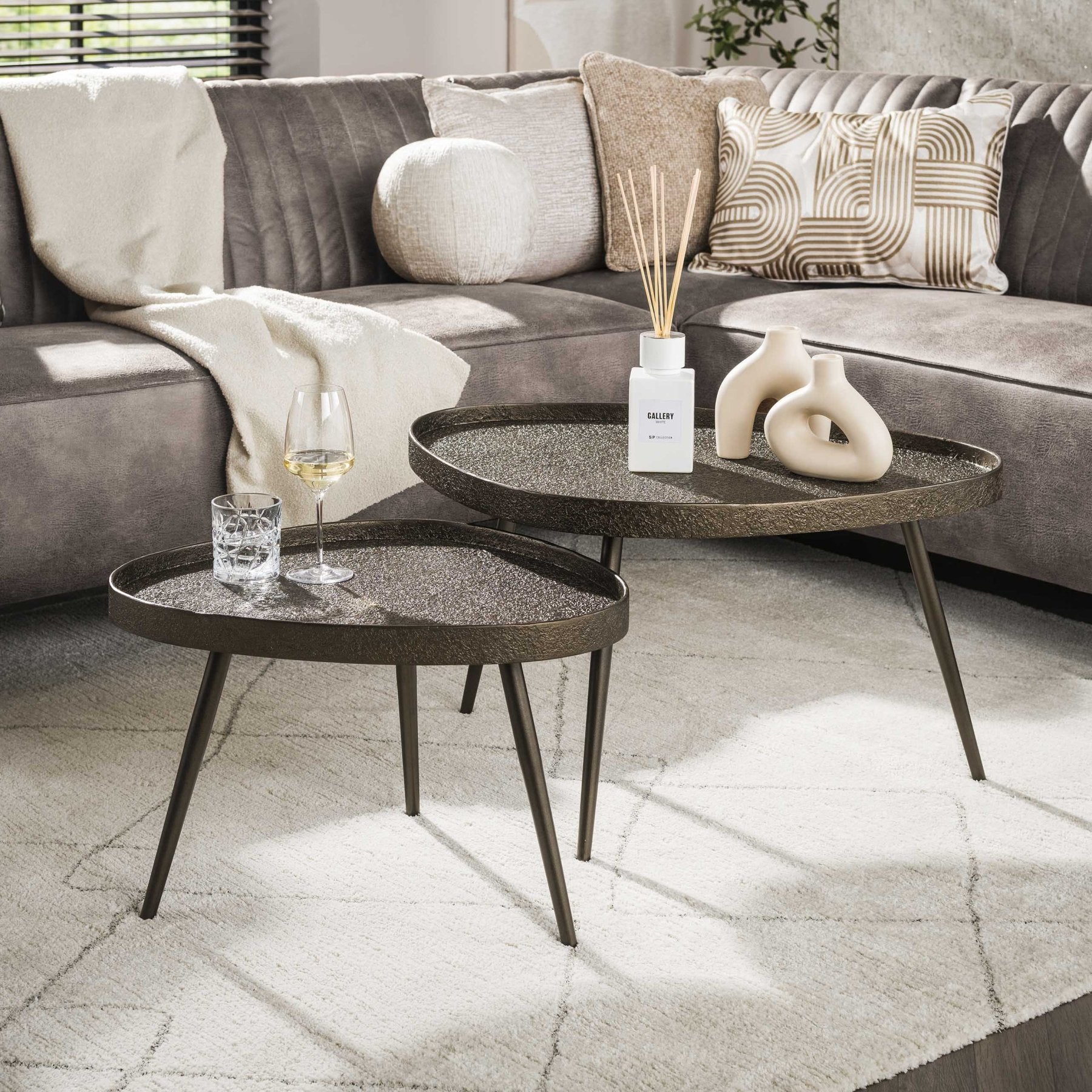 The Luna Triangle coffee table set of 2 brings an eye-catching, sculptural touch to your living room. This set consists of two triangular side tables crafted in bronze liquid metal with a refined, lightly reflective finish. The design focuses on both function and aesthetics: thanks to the triangular silhouette, the tables can be used solo or combined in modern and industrial interiors.