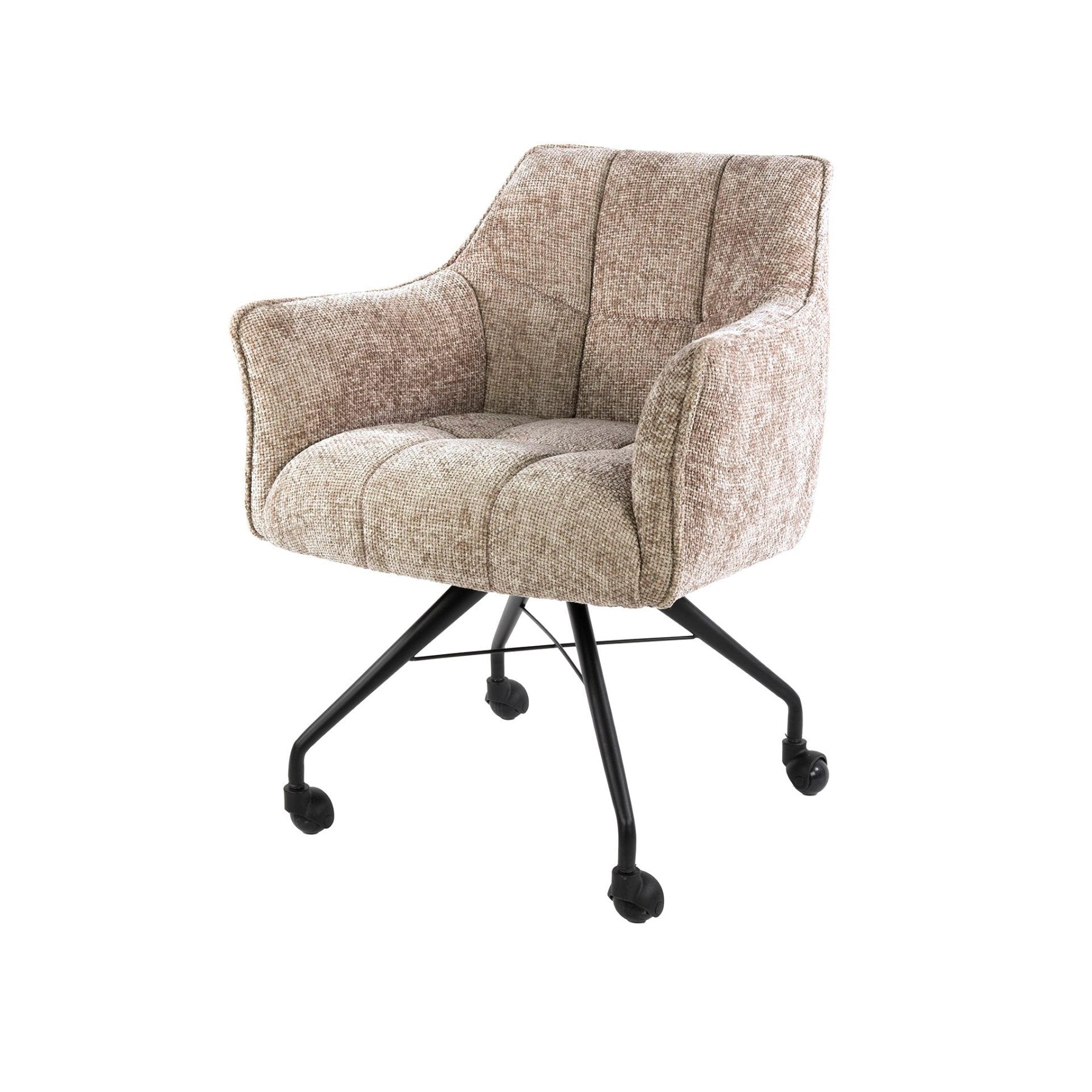This set of 2 dining chairs in the Hoven rich sand color combines a subtle appearance with practical wheels for easy movement. The upholstery is made in Hoven rich sand, giving the chairs a warm, natural hue that blends well with various interior styles. The seat offers solid support and a compact size, making the chairs suitable for both smaller dining rooms and offices.