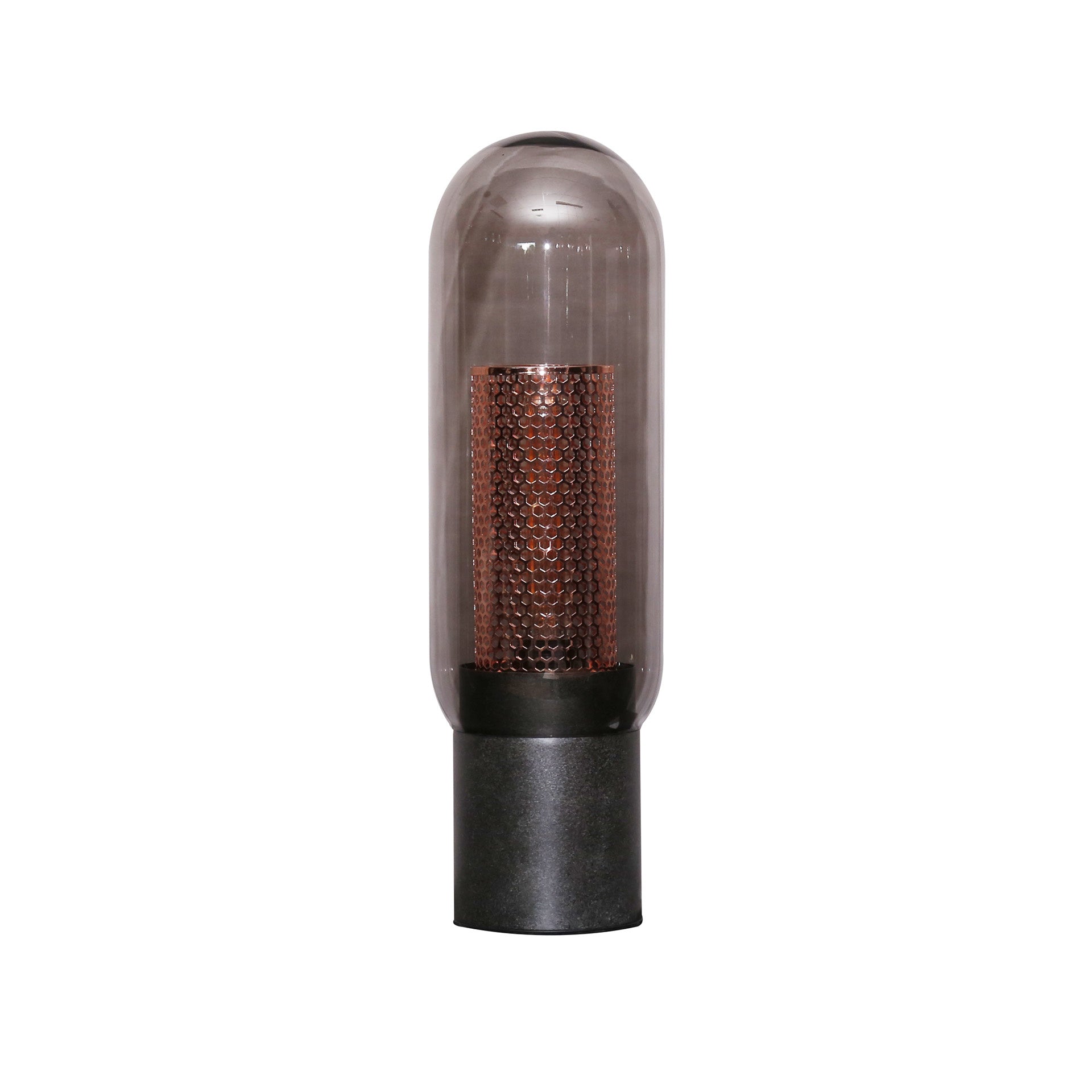 Table lamp Hilda 1-light black is of contemporary design, in which craftsmanship and style come together. The lamp is provided with hand-blown smoke glass roof, which not only offers a refined aesthetics but also adds a touch of mystery to the light radiation. Within this glass shell is a cylindrical cover of copper mesh, which gives a subtle industrial touch to the whole and contributes to the unique appearance of the lamp.