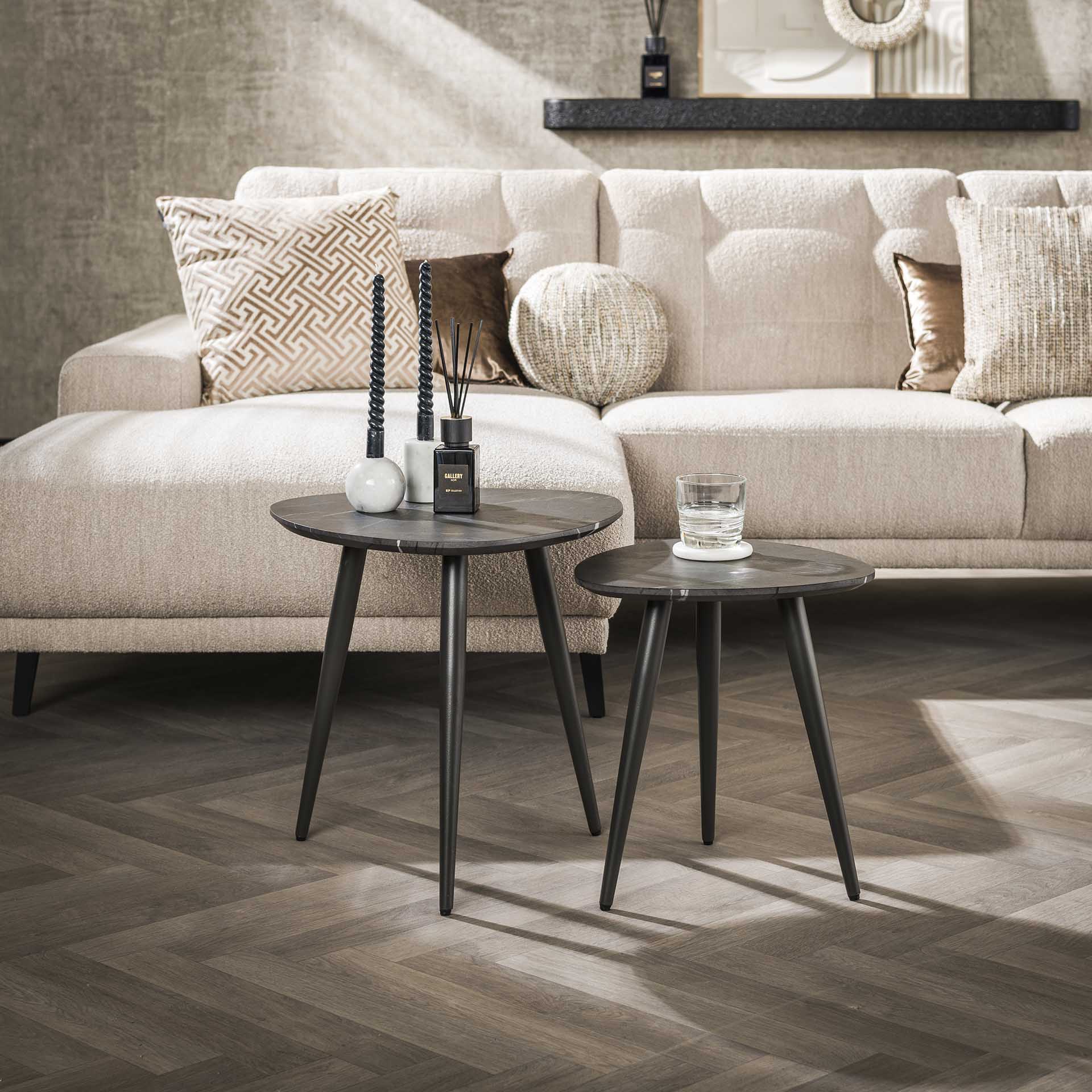 Description and specifications of Triangular Coffee Table Set of 2 Conner Ceramic Look Gray