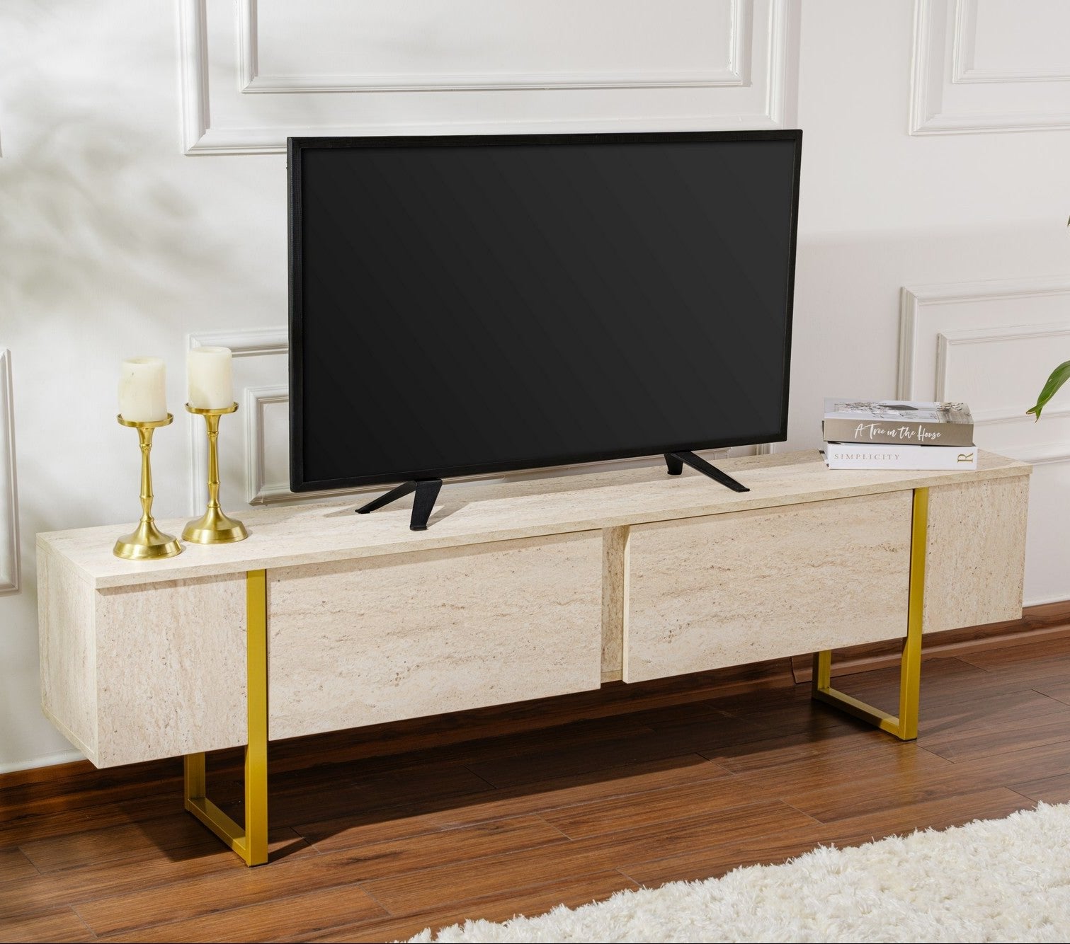 Say goodbye to boring and outdated TV stands. Our travertine and gold TV unit will instantly give your living room a glamorous and stylish look. It is the perfect mix of modern design and timeless elegance.