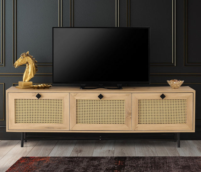 This piece of furniture is perfect for those who love a modern decor with a natural touch. The combination of warm oak wood and rattan finish gives your living room a unique and timeless appearance. With its generous dimensions, there is plenty of space for televisions up to 70 inches, and you can neatly store your multimedia equipment.
