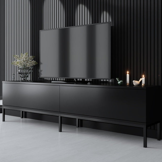 This TV stand with metal legs exudes elegance and adds a touch of contemporary charm to any space. The black color(s) of the product seamlessly fits into any interior, making it a versatile choice for your home. The generous width of 180 cm provides ample space for your television, gaming consoles, and other media devices, while the height of 47 cm and depth of 30 cm offer optimal viewing angles for an immersive entertainment experience.