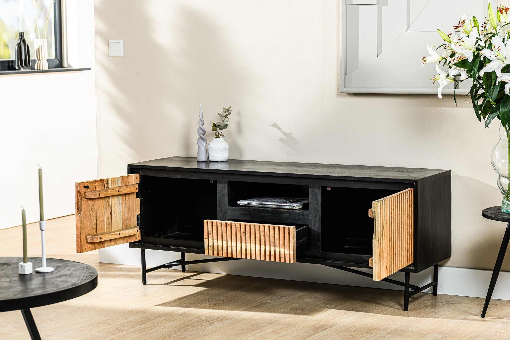 TV furniture Myra is made of acacia wood. Acacia is a particularly sustainable hardwood species. Characteristic of this type of wood are the changes in color, the flame drawing and fine grain. These features give furniture of this type of wood a warm appearance. It immediately adds a lot of atmosphere to your interior. Acacia Wood is a natural product, this means that irregularities can occur in shape and color.