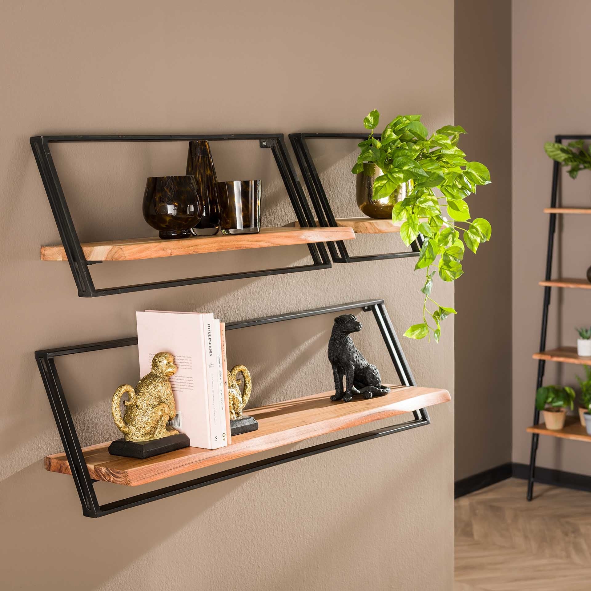 The frame around the shelves is made of black metal. The black color in combination with the acacia wood fits very well with contemporary interior trends and gives the wall shelves a sturdy look.