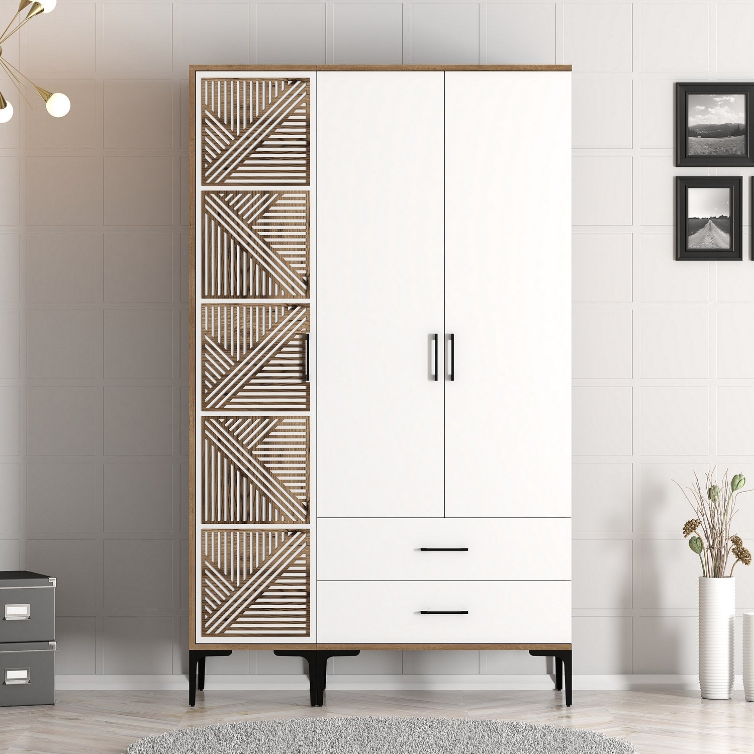 With its beautiful combination of walnut and white colors, this wardrobe will instantly elevate the atmosphere of your bedroom. The rich walnut finish adds warmth and depth, while the fresh white accents bring a touch of modernity. It is the perfect mix of classic and contemporary design, making it a versatile addition to any bedroom style.